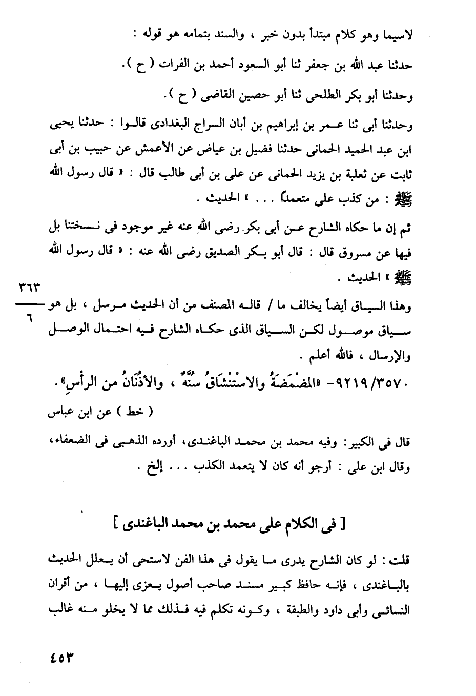 قلت: لو كان الشارح يدرى ما يقول في هذا الفن لاستحى أن يعلل الحديث بالباغندى، فإنه حافظ كبير مسند صاحب أصول يعزى إليها، من أقران النسائى وأبي داود والطبقة، وكونه تكلم فيه فذلك مما لا يخلو منه غالب