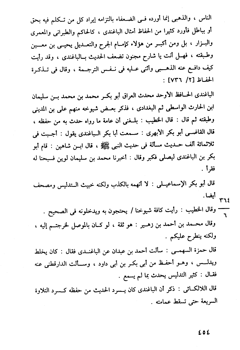 قال اللالكائى: ذكر أن الباغندى كان يسرد الحديث من حفظه كسرد التلاوة السريعة حتى تسقط عمامته.