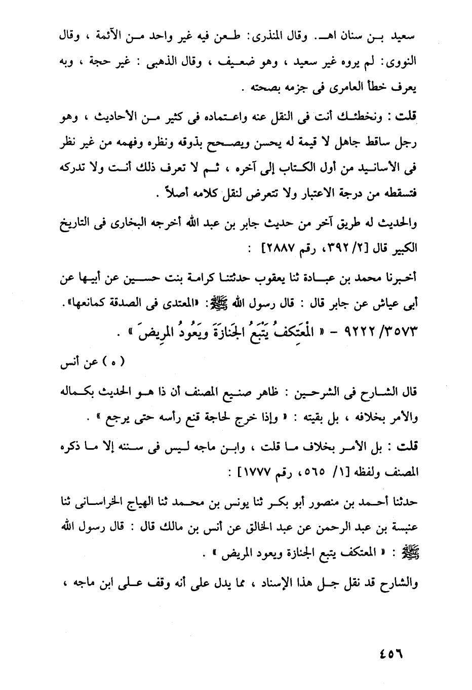 حدثنا أحمد بن منصور أبو بكر ثنا يونس بن محمد ثنا الهياج الخراسانى ثنا عنبسة بن عبد الرحمن عن عبد الخالق عن أنس بن مالك قال: قال رسول اللَّه -صلى اللَّه عليه وسلم-: "المعتكف يتبع الجنازة ويعود المريض".