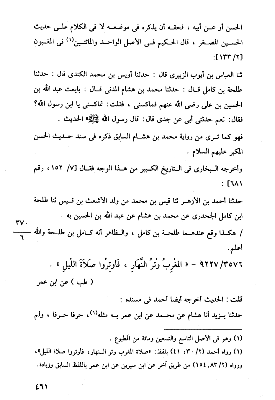 (¬2) رواه أحمد (2/ 30، 41) بلفظ: "صلاة المغرب وتر النهار، فأوتروا صلاة الليل"، ورواه (2/ 83، 154) من طريق آخر عن ابن سيرين عن ابن عمر باللفظ السابق وزيادة.