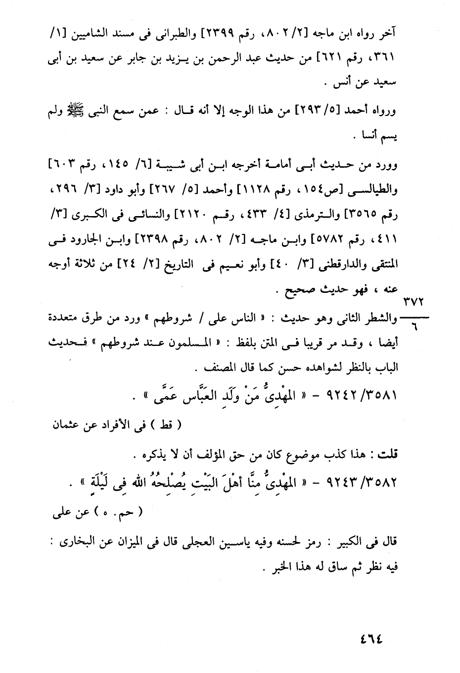 3582/ 9243 - "المهْدِيُّ مِنَّا أَهْلَ البَيْتِ يُصْلِحُهُ اللَّه فِي لَيْلَةٍ".