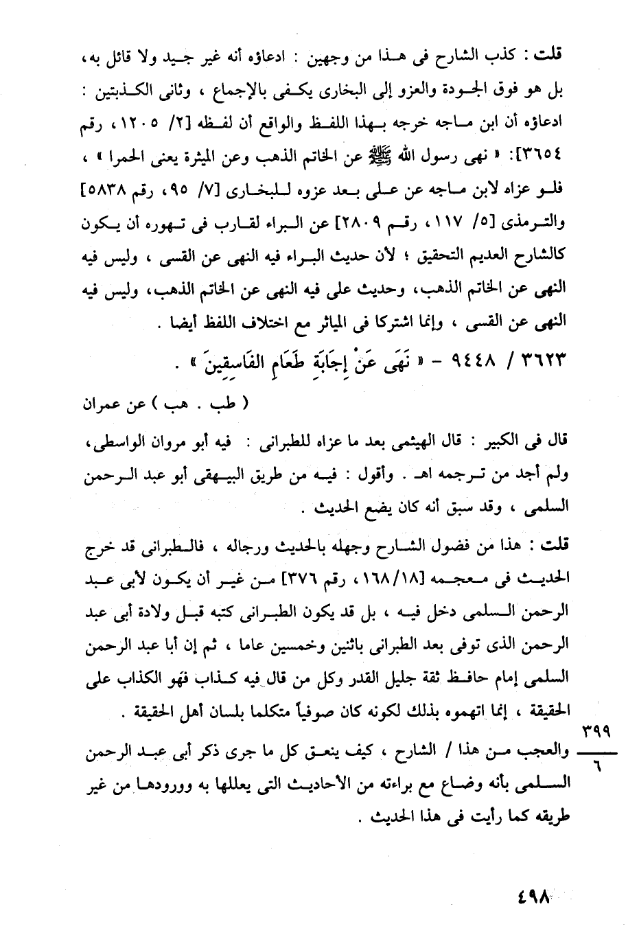 قلت: كذب الشارح في هذا من وجهين: ادعاؤه أنه غير جيد ولا قائل به، بل هو فوق الجودة والعزو إلى البخارى يكفى بالإجماع، وثانى الكذبتين: ادعاؤه أن ابن ماجه خرجه بهذا اللفظ والواقع أن لفظه [2/ 1205، رقم 3654]: "نهى رسول اللَّه -صلى اللَّه عليه وسلم- عن الخاتم الذهب وعن الميثرة يعنى الحمرا"، فلو عزاه لابن ماجه عن على بعد عزوه للبخارى [7/ 95، رقم 5838] والترمذى [5/ 117، رقم 2809] عن البراء لقارب في تهوره أن يكون كالشارح العديم التحقيق؛ لأن حديث البراء فيه النهى عن القسى، وليس فيه النهى عن الخاتم الذهب، وحديث على فيه النهى عن الخاتم الذهب، وليس فيه النهى عن القسى، وإنما اشتركا في المياثر مع اختلاف اللفظ أيضًا.
