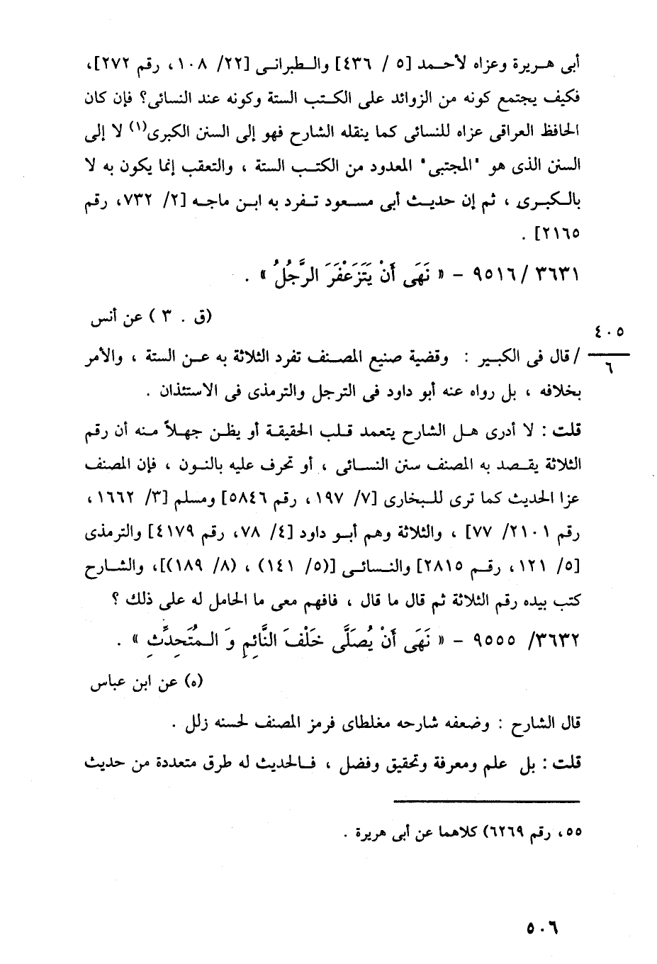 قلت: لا أدرى هل الشارح يتعمد قلب الحقيقة أو يظن جهلًا منه أن رقم الثلاثة يقصد به المصنف سنن النسائى، أو تحرف عليه بالنون، فإن المصنف عزا الحديث كما ترى للبخارى [7/ 197، رقم 5846] ومسلم [3/ 1662، رقم 2101/ 77]، والثلاثة وهم أبو داود [4/ 78، رقم 4179] والترمذى [5/ 121، رقم 2815] والنسانى [(5/ 141)، (8/ 189)]، والشارح كتب بيده رقم الثلاثة ثم قال ما قال، فافهم معى ما الحامل له على ذلك؟