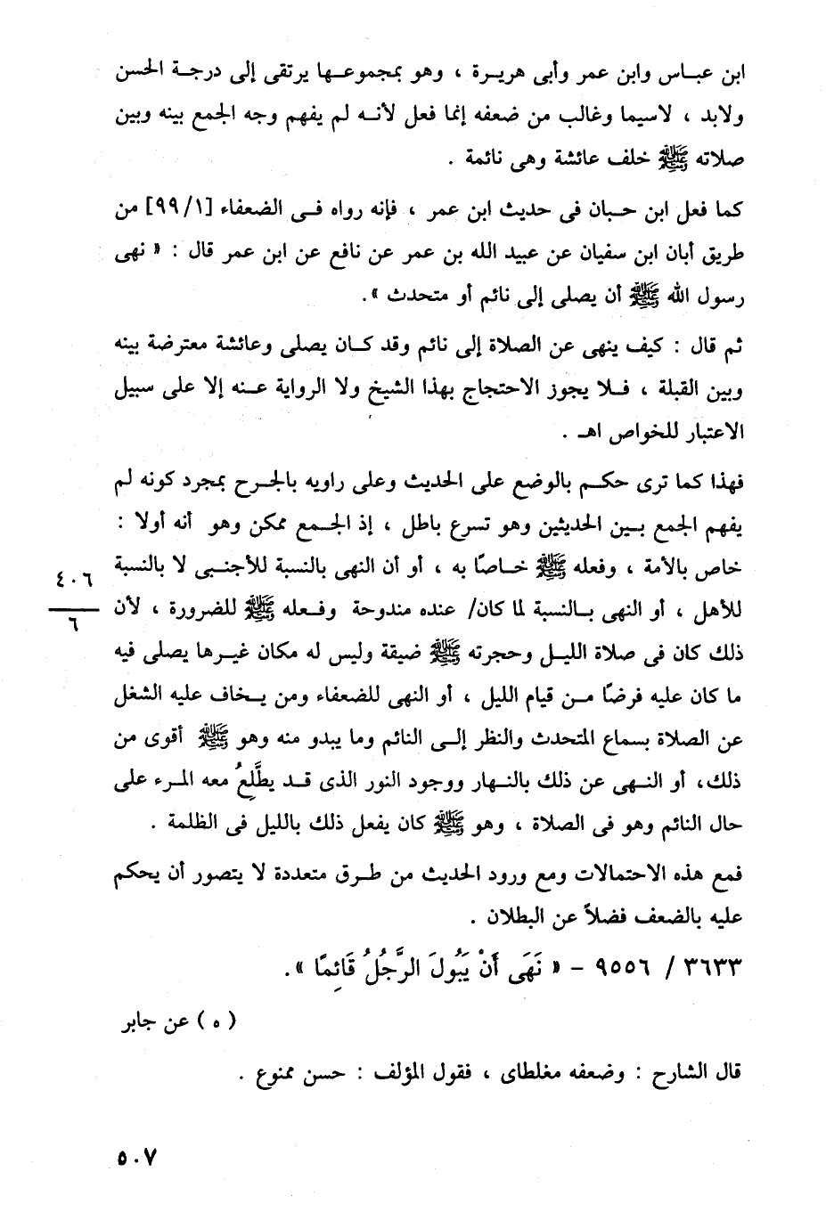 فهذا كما ترى حكم بالوضع على الحديث وعلى راويه بالجرح بمجرد كونه لم يفهم الجمع بين الحديثين وهو تسرع باطل، إذ الجمع ممكن وهو أنه أولا: خاص بالأمة، وفعله -صلى اللَّه عليه وسلم- خاصًا به، أو أن النهى بالنسبة للأجنبى لا بالنسبة للأهل، أو النهى بالنسبة لما كان عنده مندوحة وفعله -صلى اللَّه عليه وسلم- للضرورة، لأن ذلك كان في صلاة الليل وحجرته -صلى اللَّه عليه وسلم- ضيقة وليس له مكان غيرها يصلى فيه ما كان عليه فرضًا من قيام الليل، أو النهى للضعفاء ومن يخاف عليه الشغل عن الصلاة بسماع المتحدث والنظر إلى النائم وما يبدو منه وهو -صلى اللَّه عليه وسلم- أقوى من ذلك، أو النهى عن ذلك بالنهار ووجود النور الذي قد يطَّلِعُ معه المرء على حال النائم وهو في الصلاة، وهو -صلى اللَّه عليه وسلم- كان يفعل ذلك بالليل في الظلمة.