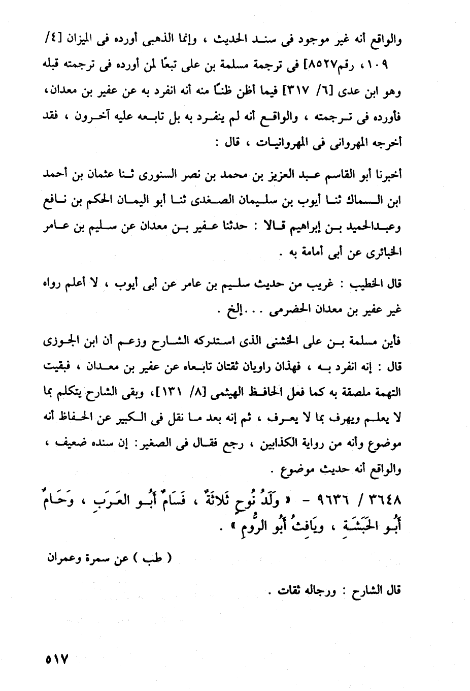 فأين مسلمة بن على الخشنى الذي استدركه الشارح وزعم أن ابن الجوزى قال: إنه انفرد به، فهذان راويان ثقتان تابعاه عن عفير بن معدان، فبقيت التهمة ملصقة به كما فعل الحافظ الهيثمى [8/ 131]، وبقى الشارح يتكلم بما لا يعلم ويهرف بما لا يعرف، ثم إنه بعد ما نقل في الكبير عن الحفاظ أنه موضوع وأنه من رواية الكذابين، رجع فقال في الصغير: إن سنده ضعيف، والواقع أنه حديث موضوع.