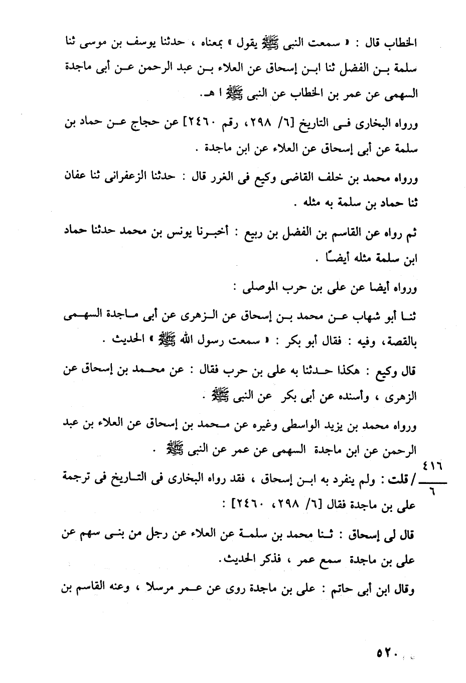 ورواه محمد بن يزيد الواسطى وغيره عن محمد بن إسحاق عن العلاء بن عبد الرحمن عن ابن ماجدة السهمى عن عمر عن النبي -صلى اللَّه عليه وسلم-.