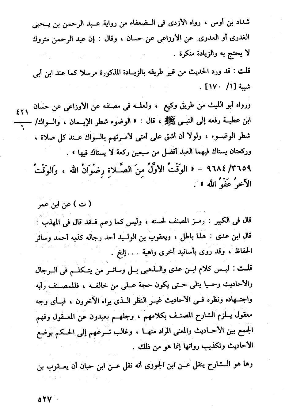 قلت: ليس كلام ابن عدى والذهبى بل وسائر من يتكلم في الرجال والأحاديث وحيا يتلى حتى يكون حجة على من خالفه، فللمصنف رأيه واجتهاده ونظره في الأحاديث غير النظر الذي يراه الآخرون، فبأى وجه معقول يلزم الشارح المصنف بكلامهم، وجلهم بعيدون عن المعقول وفهم الجمع بين الأحاديث والمعنى المراد منها، وغالب تسرعهم إلى الحكم بوضع الأحاديث وتكذيب رواتها إنما هو من ذلك.