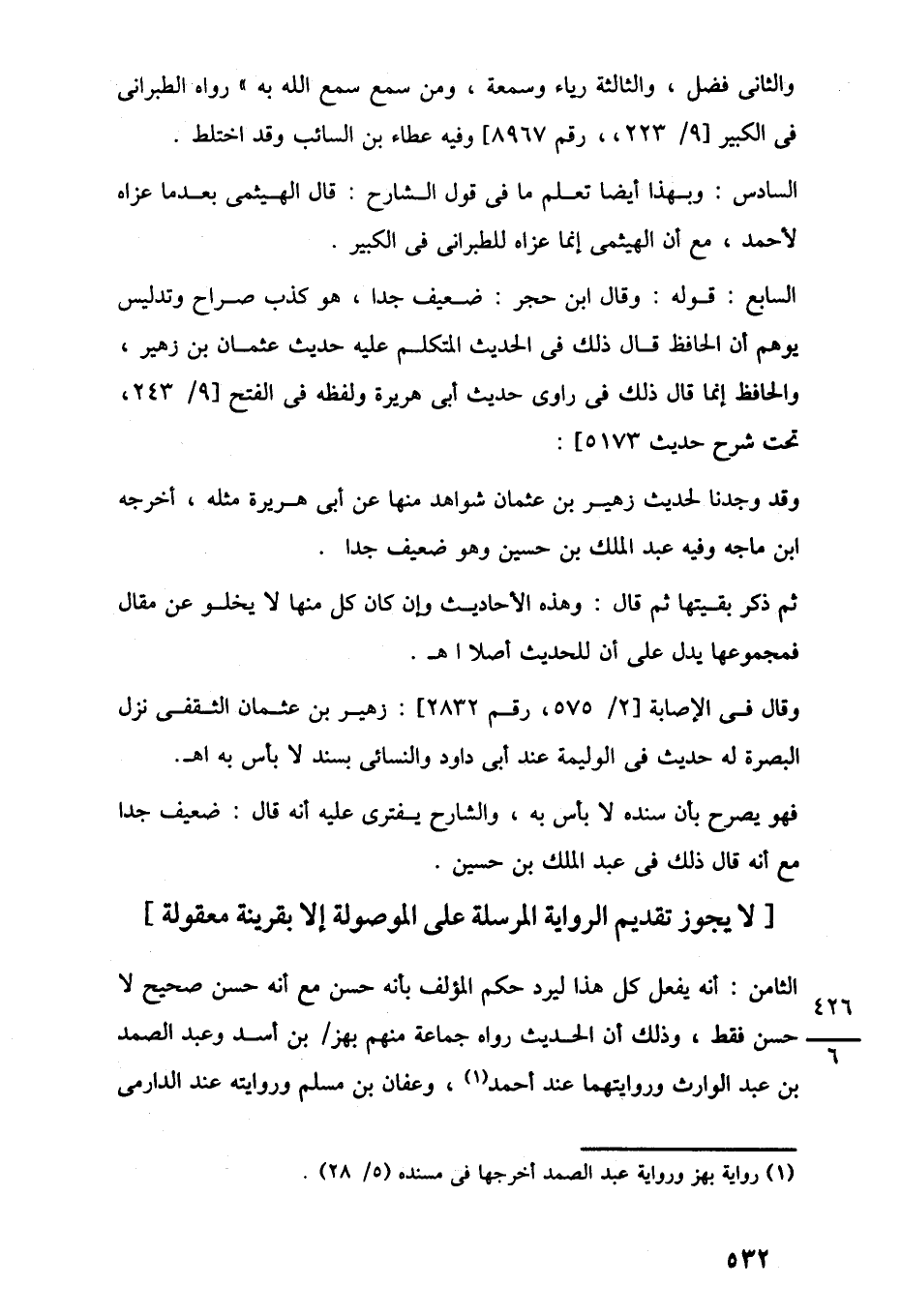 فهو يصرح بأن سنده لا بأس به، والشارح يفترى عليه أنه قال: ضعيف جدا مع أنه قال ذلك في عبد الملك بن حسين.