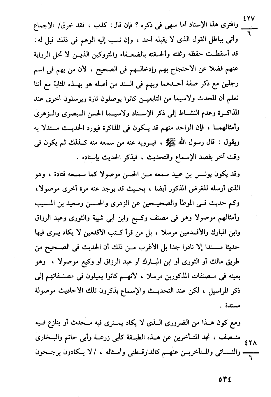 ومع كون هذا من الضرورى الذي لا يكاد يمترى فيه محدث أو ينازع فيه منصف، تجد المتأخرين عن هذه الطبقة كأبي زرعة وأبي حاتم والبخارى والنسائى والمتأخرين عنهم كالدارقطنى وأمثاله، لا يكادون يرجحون