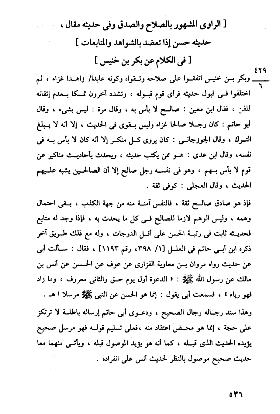 فإذ هو صادق صالح ثقة، فالنفس آمنة منه من جهة الكذب، بقى احتمال وهمه، وليس الوهم لازما للصالح في كل ما يحدث به، فإذا وجد له متابع فحديثه ثابت في رتبة الحسن على أقل الدرجات، وله مع ذلك طريق آخر ذكره ابن أبي حاتم في العلل [1/ 398، رقم 1193]، فقال: سألت أبي عن حديث رواه مروان بن معاوية الفزارى عن عوف عن الحسن عن أنس بن مالك عن رسول اللَّه -صلى اللَّه عليه وسلم-: "الدعوة أول يوم حق والثانى معروف، وما زاد فهو رياء"، فسمعت أبي يقول: إنما هو الحسن عن النبي -صلى اللَّه عليه وسلم- مرسلا اهـ.