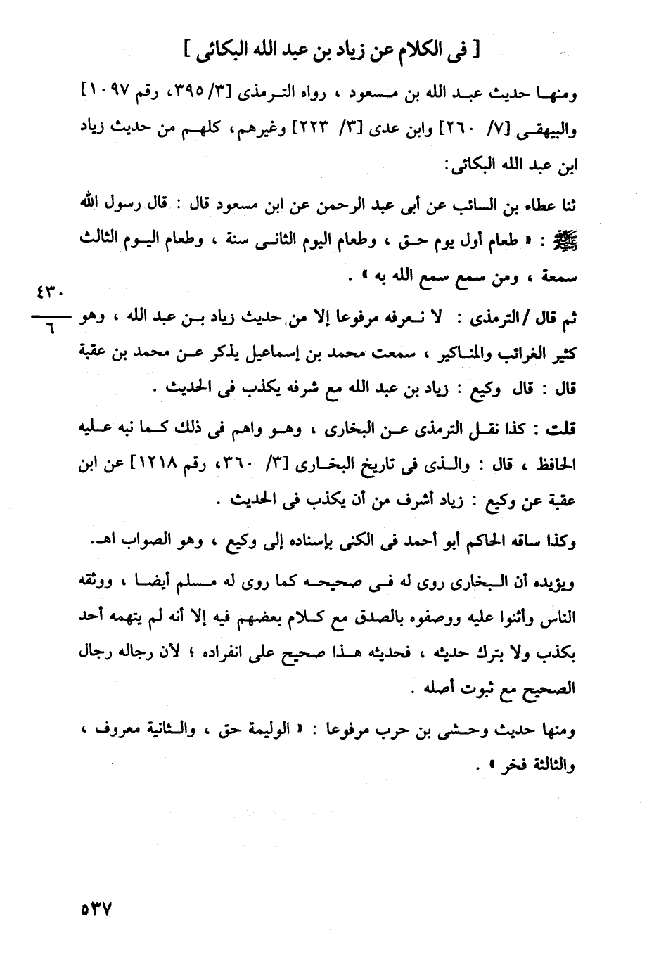 ومنها حديث عبد اللَّه بن مسعود، رواه الترمذى [3/ 395، رقم 1097] والبيهقى [7/ 260] وابن عدى [3/ 223] وغيرهم، كلهم من حديث زياد ابن عبد اللَّه البكائى: