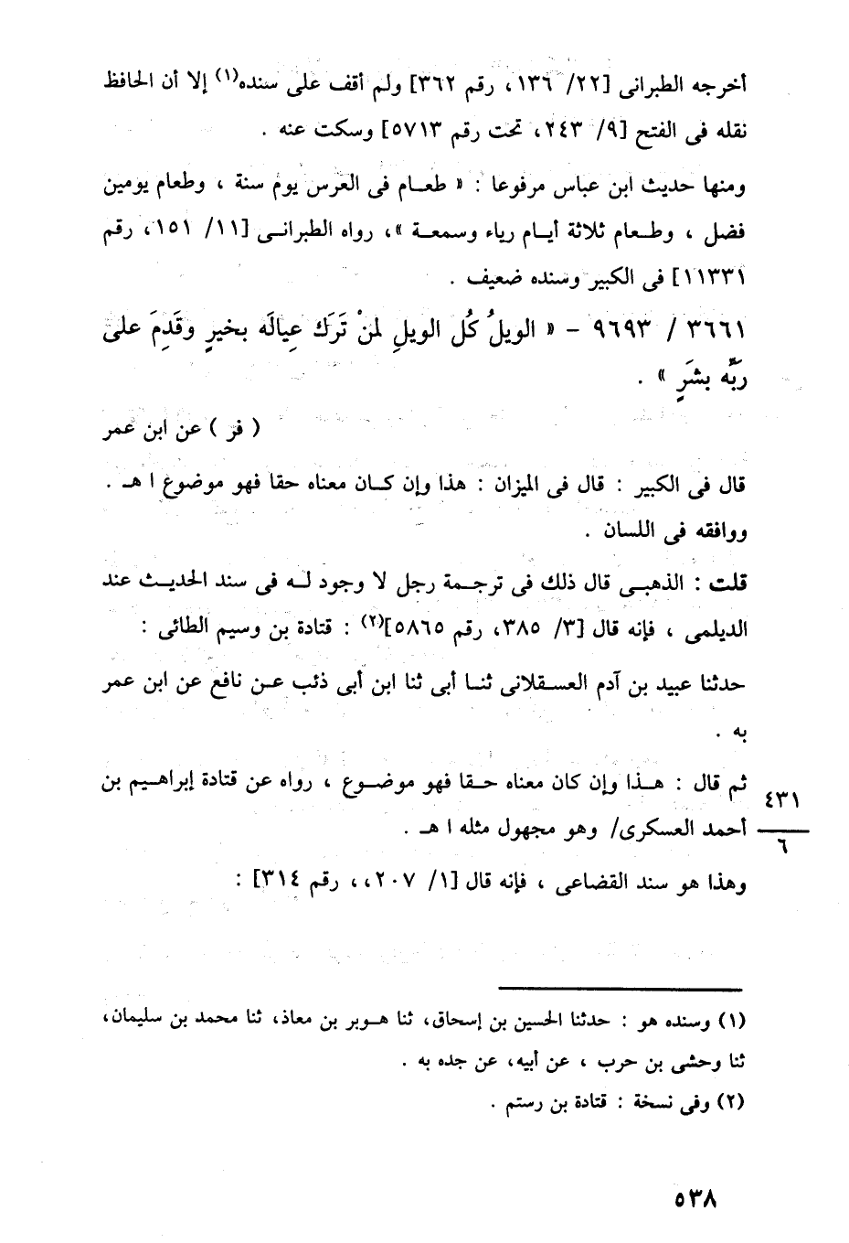 ومنها حديث ابن عباس مرفوعًا: "طعام في العرس يوم سنة، وطعام يومين فضل، وطعام ثلاثة أيام رياء وسمعة"، رواه الطبرانى [11/ 151، رقم 11331] في الكبير وسنده ضعيف.