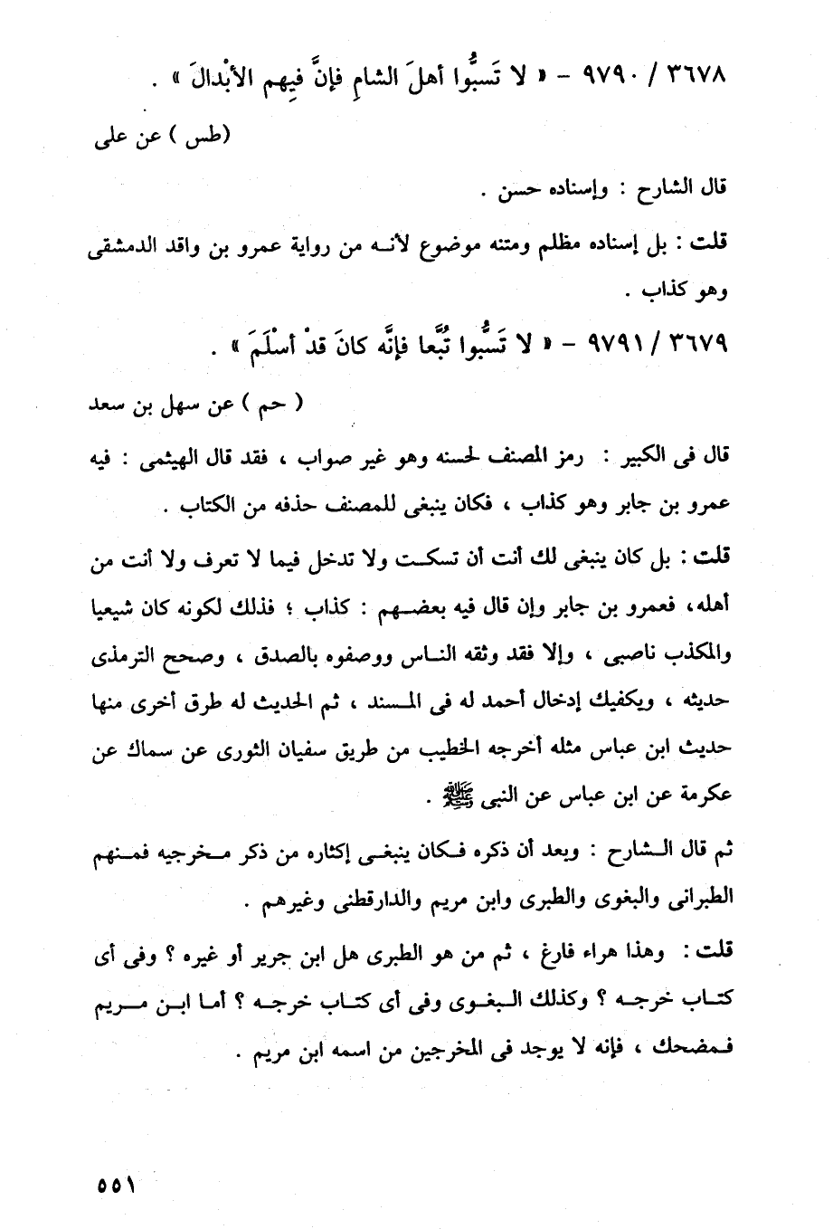 قلت: بل كان ينبغى للَّه أنت أن تسكت ولا تدخل فيما لا تعرف ولا أنت من أهله، فعمرو بن جابر وإن قال فيه بعضهم: كذاب؛ فذلك لكونه كان شيعيا والمكذب ناصبى، وإلا فقد وثقه الناس ووصفوه بالصدق، وصحح الترمذى حديثه، ويكفيك إدخال أحمد له في المسند، ثم الحديث له طرق أخرى منها حديث ابن عباس مثله أخرجه الخطيب من طريق سفيان الثورى عن سماك عن عكرمة عن ابن عباس عن النبي -صلى اللَّه عليه وسلم-.