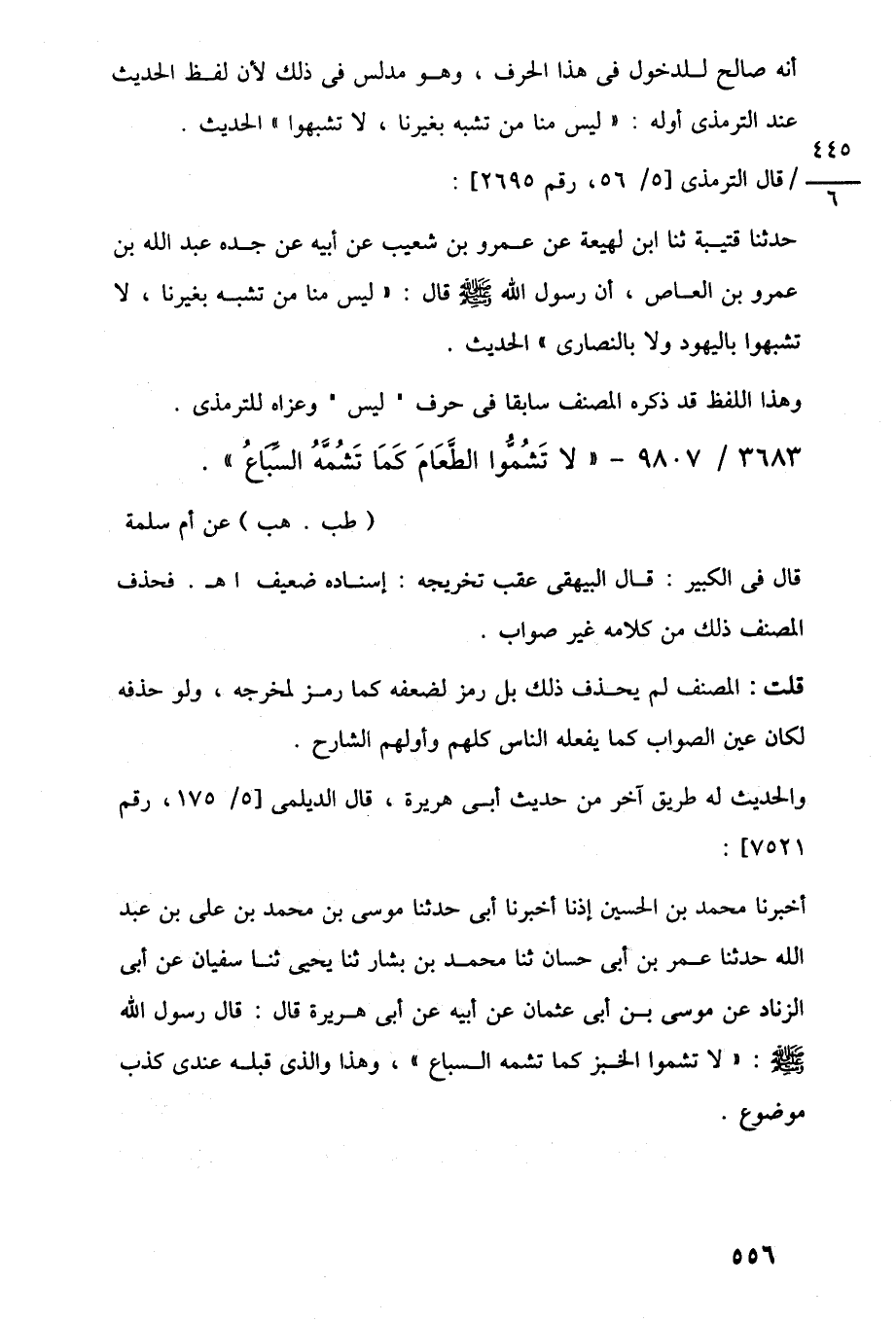 حدثنا قتيبة ثنا ابن لهيعة عن عمرو بن شعيب عن أبيه عن جده عبد اللَّه بن عمرو بن العاص، أن رسول اللَّه -صلى اللَّه عليه وسلم- قال: "ليس منا من تشبه بغيرنا، لا تشبهوا باليهود ولا بالنصارى" الحديث.