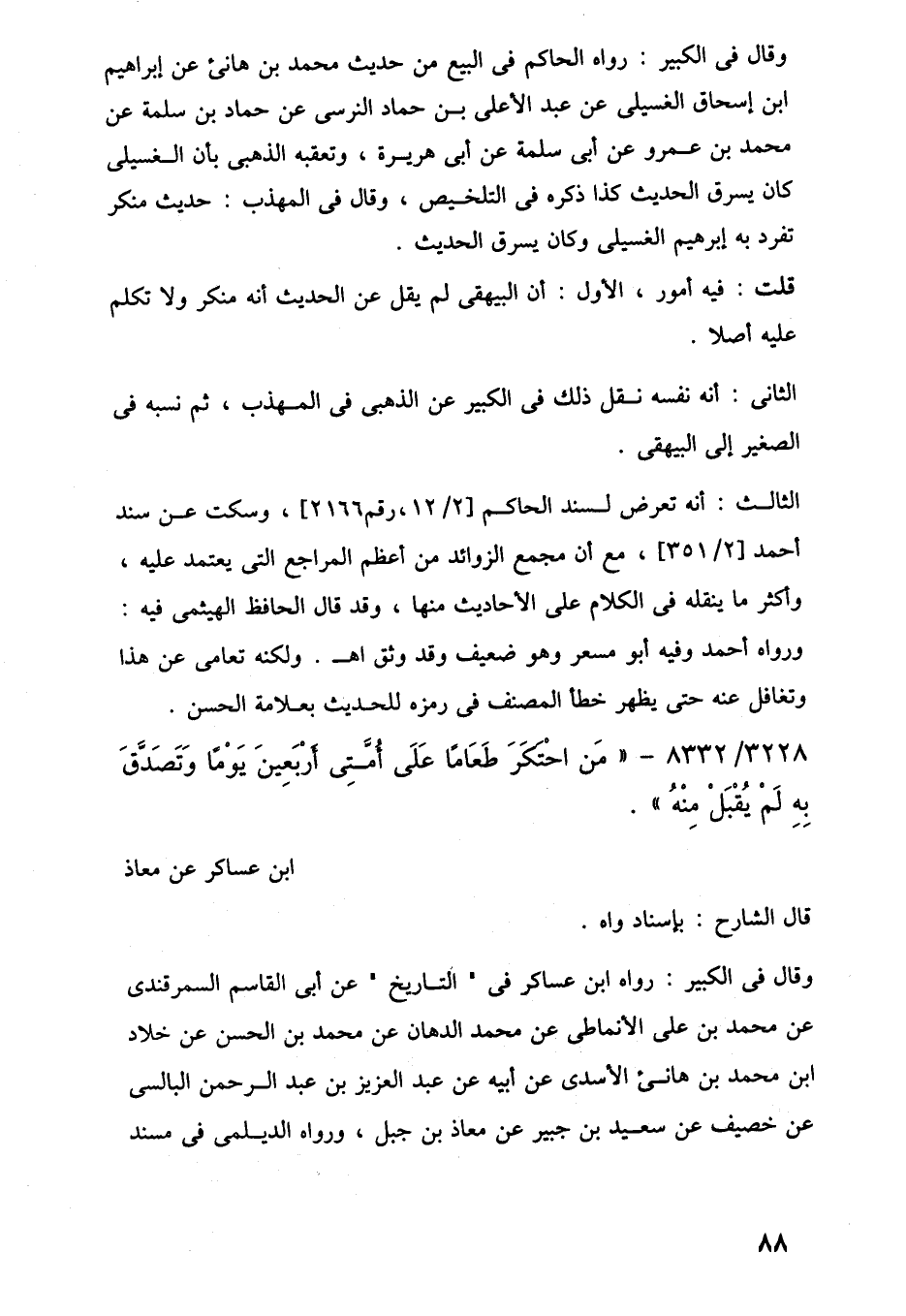 الثالث: أنه تعرض لسند الحاكم [2/ 12، رقم 2166]، وسكت عن سند أحمد [2/ 351]، مع أن مجمع الزوائد من أعظم المراجع التي يعتمد عليه، وأكثر ما ينقله في الكلام على الأحاديث منها، وقد قال الحافظ الهيثمى فيه: ورواه أحمد وفيه أبو مسعر وهو ضعيف وقد وثق اهـ. ولكنه تعامى عن هذا وتغافل عنه حتى يظهر خطأ المصنف في رمزه للحديث بعلامة الحسن.