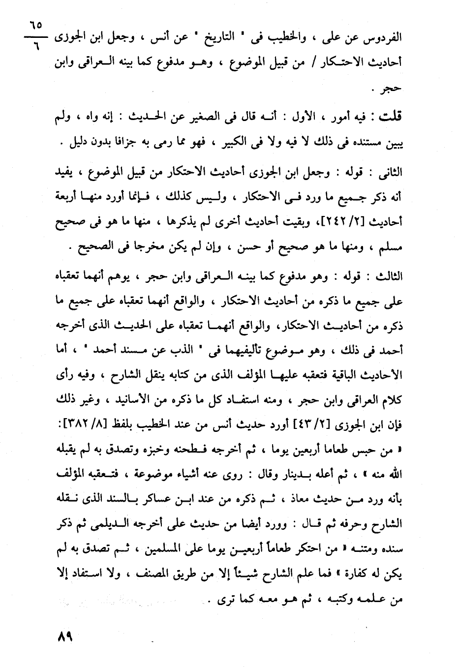 الثانى: قوله: وجعل ابن الجوزى أحاديث الاحتكار من قبيل الموضوع، يفيد أنه ذكر جميع ما ورد في الاحتكار، وليس كذلك، فإنما أورد منها أربعة أحاديث [2/ 242]، وبقيت أحاديث أخرى لم يذكرها، منها ما هو في صحيح مسلم، ومنها ما هو صحيح أو حسن، وإن لم يكن مخرجًا في الصحيح.