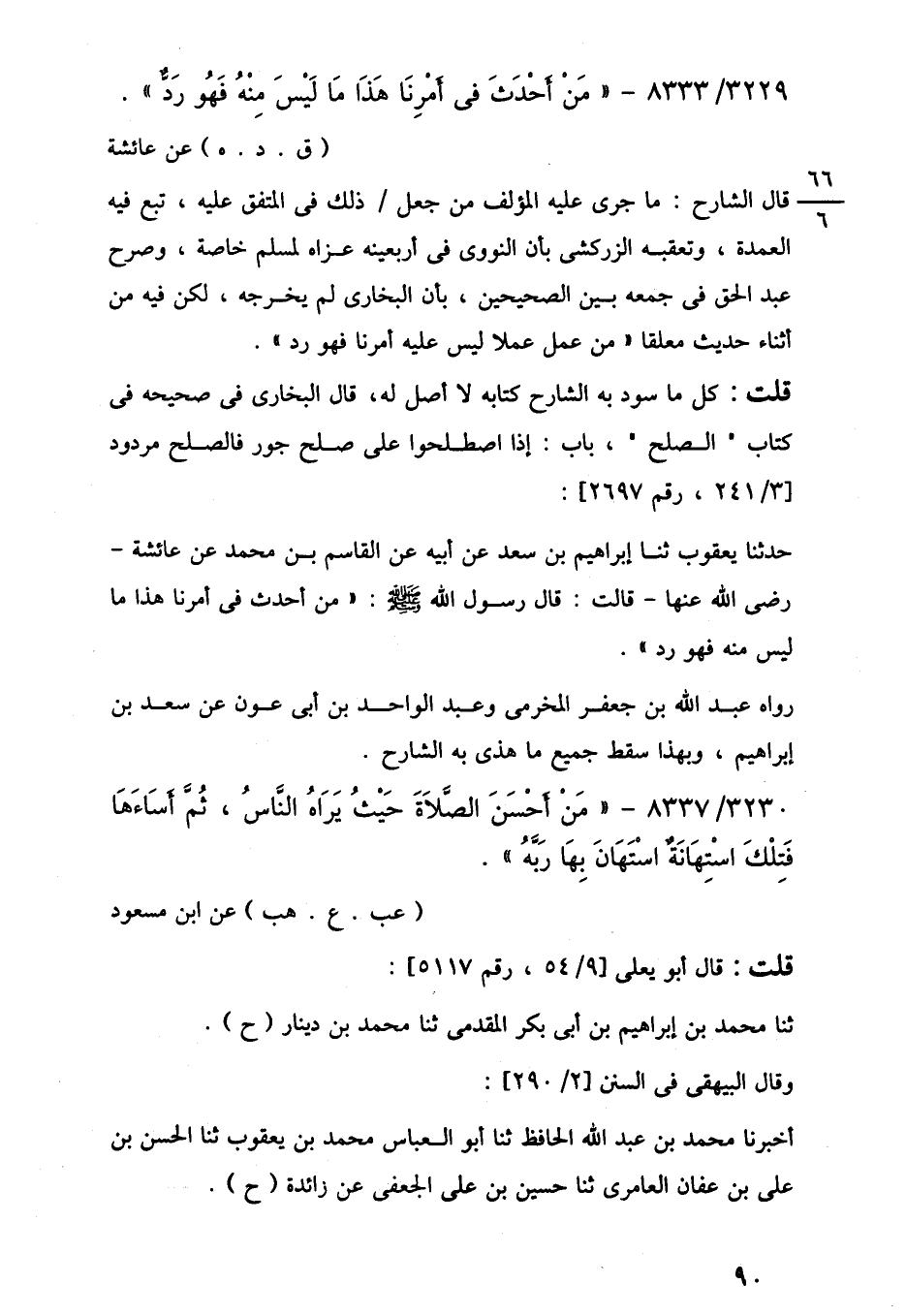 3229/ 8333 - "مَنْ أَحْدَثَ فِي أَمْرِنَا هَذَا مَا لَيْسَ مِنْهُ فَهُو رَدٌّ".