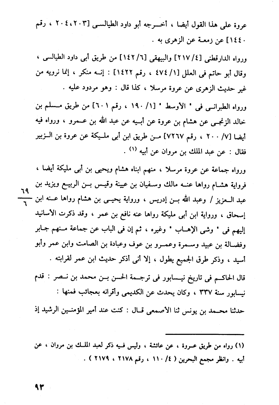 ورواه الدارقطنى [4/ 217] والبيهقى [6/ 142] من طريق أبي داود الطيالسى، وقال أبو حاتم في العلل [1/ 474، رقم 1422]: إنه منكر، إنما نرويه من غير حديث الزهرى عن عروة مرسلا، كذا قال: وهو مردود عليه.