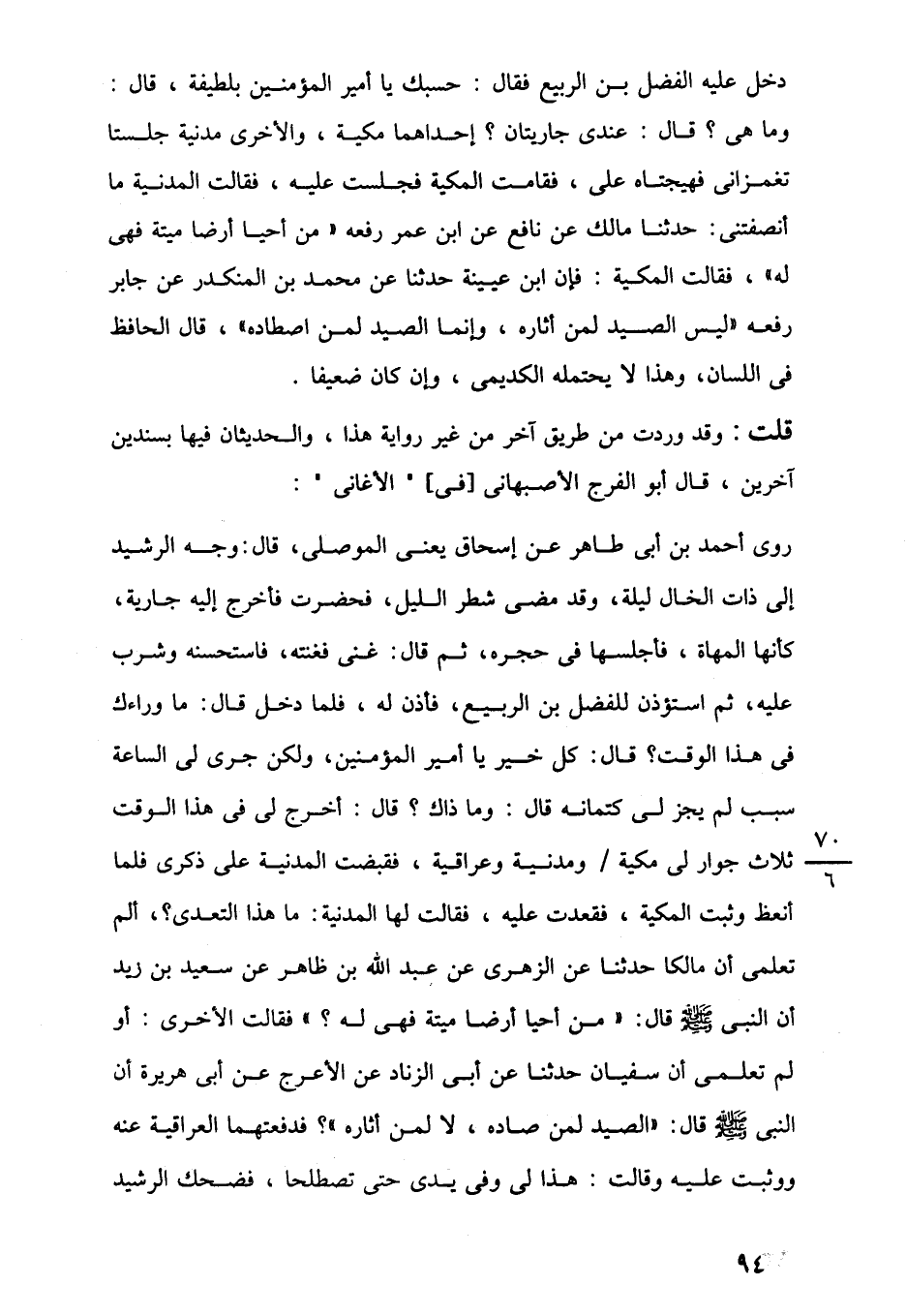 روى أحمد بن أبي طاهر عن إسحاق يعنى الموصلى، قال: وجه الرشيد إلى ذات الخال ليلة، وقد مضى شطر الليل، فحضرت فأخرج إليه جارية، كأنها المهاة، فأجلسها في حجره، ثم قال: غنى فغنته، فاستحسنه وشرب عليه، ثم استؤذن للفضل بن الربيع، فأذن له، فلما دخل قال: ما وراءك في هذا الوقت؟ قال: كل خير يا أمير المؤمنين، ولكن جرى لي الساعة سبب لم يجز لي كتمانه قال: وما ذاك؟ قال: أخرج لي في هذا الوقت ثلاث جوار لي مكية ومدنية وعراقية، فقبضت المدنية على ذكرى فلما أنعظ وثبت المكية، فقعدت عليه، فقالت لها المدنية: ما هذا التعدى؟، ألم تعلمى أن مالكًا حدثنا عن الزهرى عن عبد اللَّه بن ظاهر عن سعيد بن زيد أن النبي -صلى اللَّه عليه وسلم- قال: "من أحيا أرضًا ميتة فهي له؟ " فقالت الأخرى: أو لم تعلمى أن سفيان حدثنا عن أبي الزناد عن الأعرج عن أبي هريرة أن النبي -صلى اللَّه عليه وسلم- قال: "الصيد لمن صاده، لا لمن أثاره"؟ فدفعتهما العراقية عنه ووثبت عليه وقالت: هذا لي وفي يدى حتى تصطلحا، فضحك الرشيد
