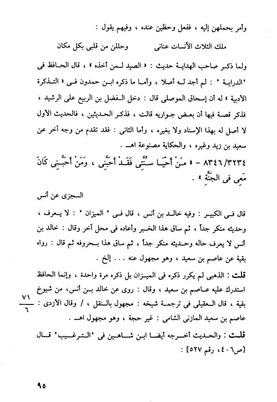 قال في الكبير: وفيه خالد بن أنس، قال في "الميزان": لا يعرف، وحديثه منكر جدًا، ثم ساق هذا الخبر وأعاده في محل آخر وقال: خالد بن أنس لا يعرف حالة وحديثه منكر جدًا، ثم ساق هذا بحروفه ثم قال: رواه بقية عن عاصم بن سعيد، وهو مجهول عنه. . . إلخ.