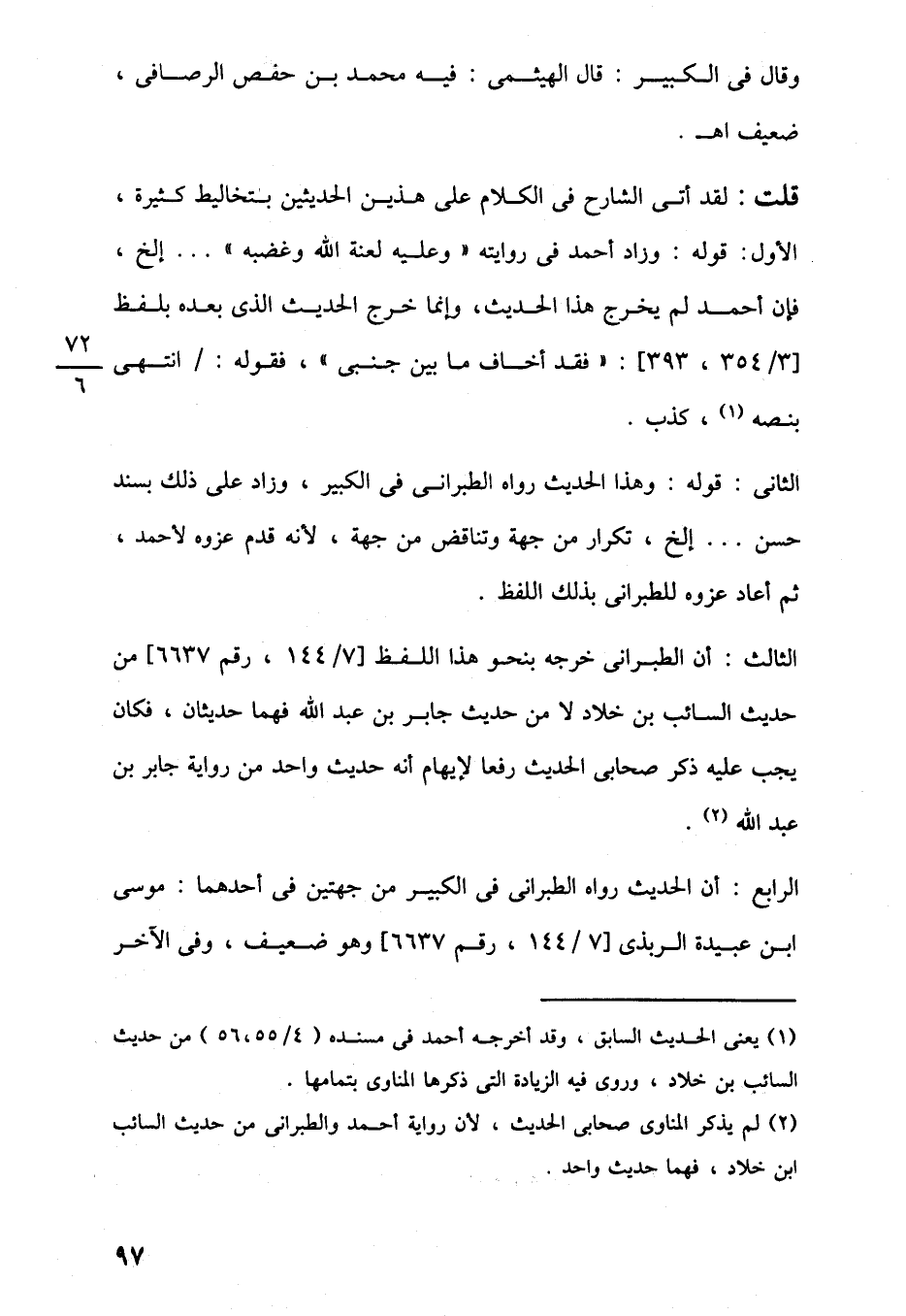 الثانى: قوله: وهذا الحديث رواه الطبرانى في الكبير، وزاد على ذلك بسند حسن. . . إلخ، تكرار من جهة وتناقض من جهة، لأنه قدم عزوه لأحمد، ثم أعاد عزوه للطبرانى بذلك اللفظ.