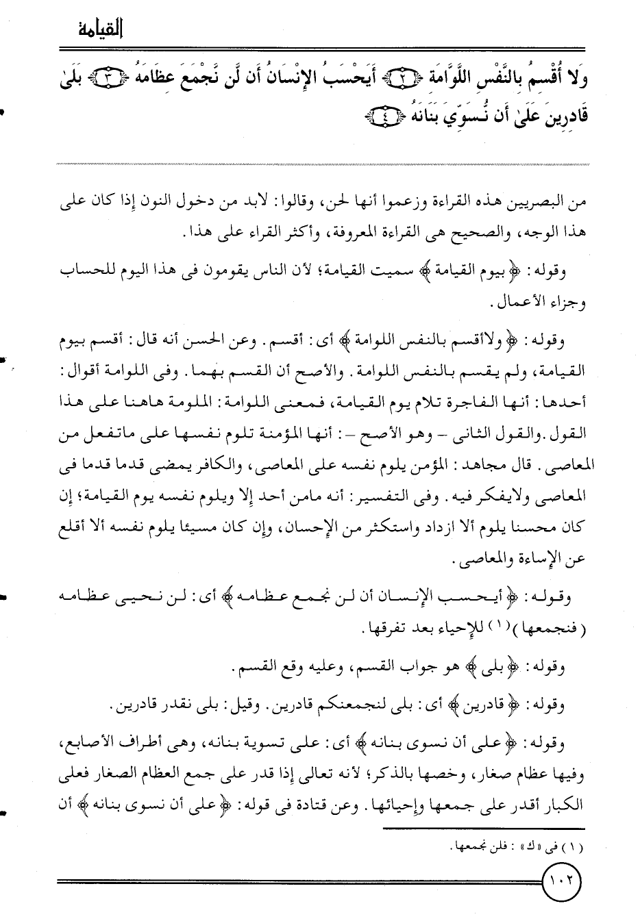 {وَلَا أقسم بِالنَّفسِ اللوامة (2) أيحسب الْإِنْسَان أَن لن نجمع عِظَامه (3) بلَى قَادِرين على أَن نسوي بنانه (4) } . من الْبَصرِيين هَذِه الْقِرَاءَة وَزَعَمُوا أَنَّهَا لحن، وَقَالُوا: لَا بُد من دُخُول النُّون إِذا كَانَ على هَذَا الْوَجْه، وَالصَّحِيح هِيَ الْقِرَاءَة الْمَعْرُوفَة، وَأكْثر الْقُرَّاء على هَذَا.