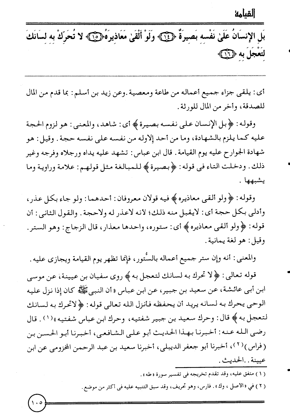 {بل الْإِنْسَان على نَفسه بَصِيرَة (14) وَلَو ألْقى معاذيره (15) لَا تحرّك بِهِ لسَانك لتعجل بِهِ (16) . أَي: يلقى جَزَاء جَمِيع أَعماله من طَاعَة ومعصية.