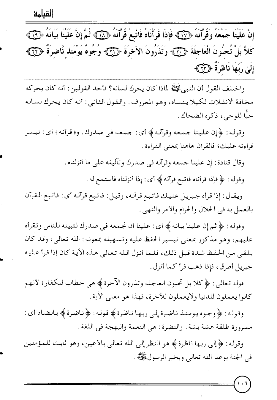 {إِن علينا جمعه وقرآنه (17) فَإِذا قرأناه فَاتبع قرآنه (18) ثمَّ إِن علينا بَيَانه (19) كلا بل تحبون العاجلة (20) وتذرون الْآخِرَة (21) وُجُوه يَوْمئِذٍ ناضرة (22) إِلَى رَبهَا ناظرة (23) } . وَاخْتلف القَوْل أَن النَّبِي لماذا كَانَ يُحَرك لِسَانه؟ فأحد الْقَوْلَيْنِ: أَنه كَانَ يحركه مَخَافَة الانفلات لكيلا ينساه، وَهُوَ الْمَعْرُوف.