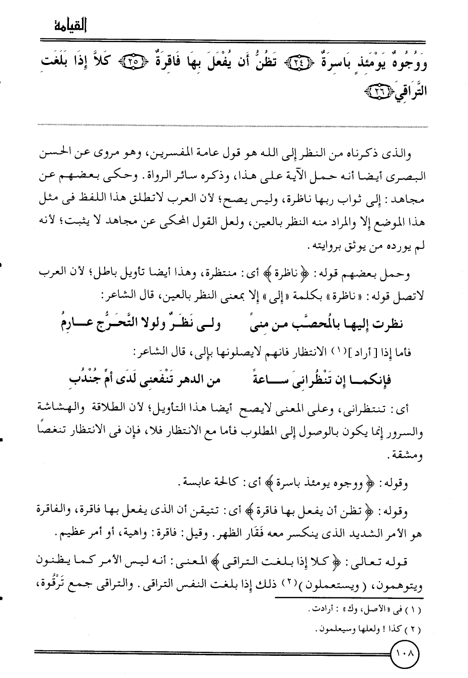 وَحمل بَعضهم قَوْله: {ناظرة} أَي: منتظرة، وَهَذَا أَيْضا تَأْوِيل بَاطِل؛ لِأَن الْعَرَب لَا تصل قَوْله: " ناظرة " بِكَلِمَة " إِلَى " إِلَّا بِمَعْنى النّظر بِالْعينِ، قَالَ الشَّاعِر: