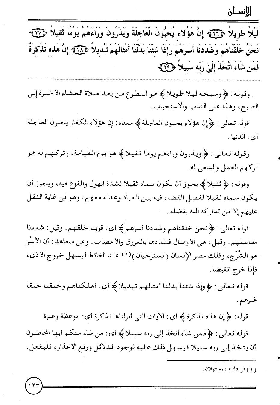 {لَيْلًا طَويلا (26) إِن هَؤُلَاءِ يحبونَ العاجلة ويذرون وَرَاءَهُمْ يَوْمًا ثقيلا (27) نَحن خلقناهم وشددنا أسرهم وَإِذا شِئْنَا بدنا أمثالهم تبديلا (28) إِن هَذِه تذكرة فَمن شَاءَ اتخذ إِلَى ربه سَبِيلا (29) } .