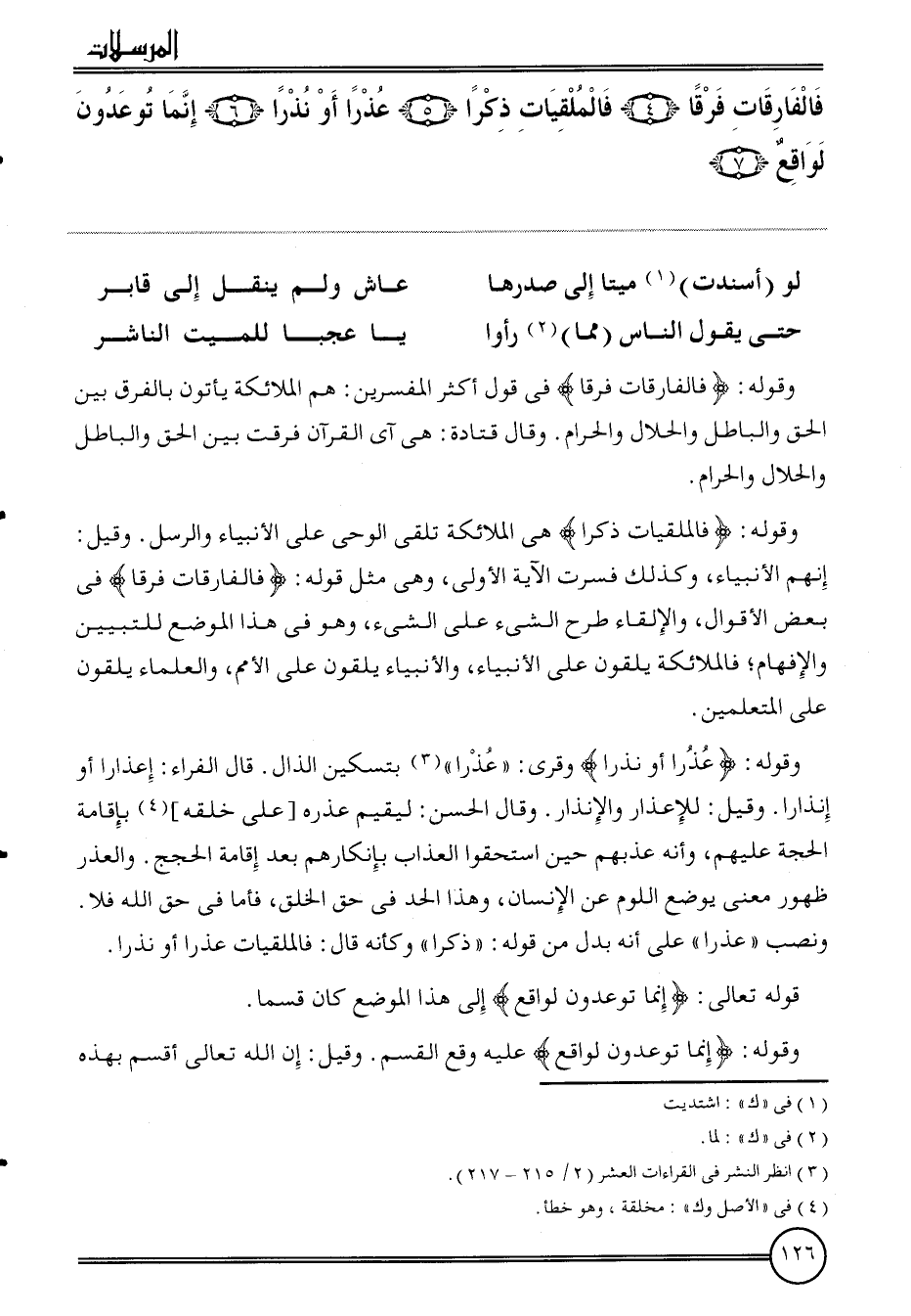 {فالفارقات فرقا (4) فالملقيات ذكرا (5) عذرا أَو نذرا (6) إِنَّمَا توعدون لوَاقِع (7) } .