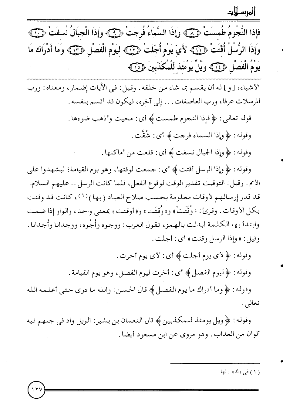 {فَإِذا النُّجُوم طمست (8) وَإِذا السَّمَاء فرجت (9) وَإِذا الْجبَال نسفت (10) وَإِذا الرُّسُل أقتت (11) لأي يَوْم أجلت (12) ليَوْم الْفَصْل (13) وَمَا أَدْرَاك مَا يَوْم الْفَصْل (14) ويل يَوْمئِذٍ للمكذبين (15) } . الْأَشْيَاء، [و] لَهُ أَن يقسم بِمَا شَاءَ من خلقه.