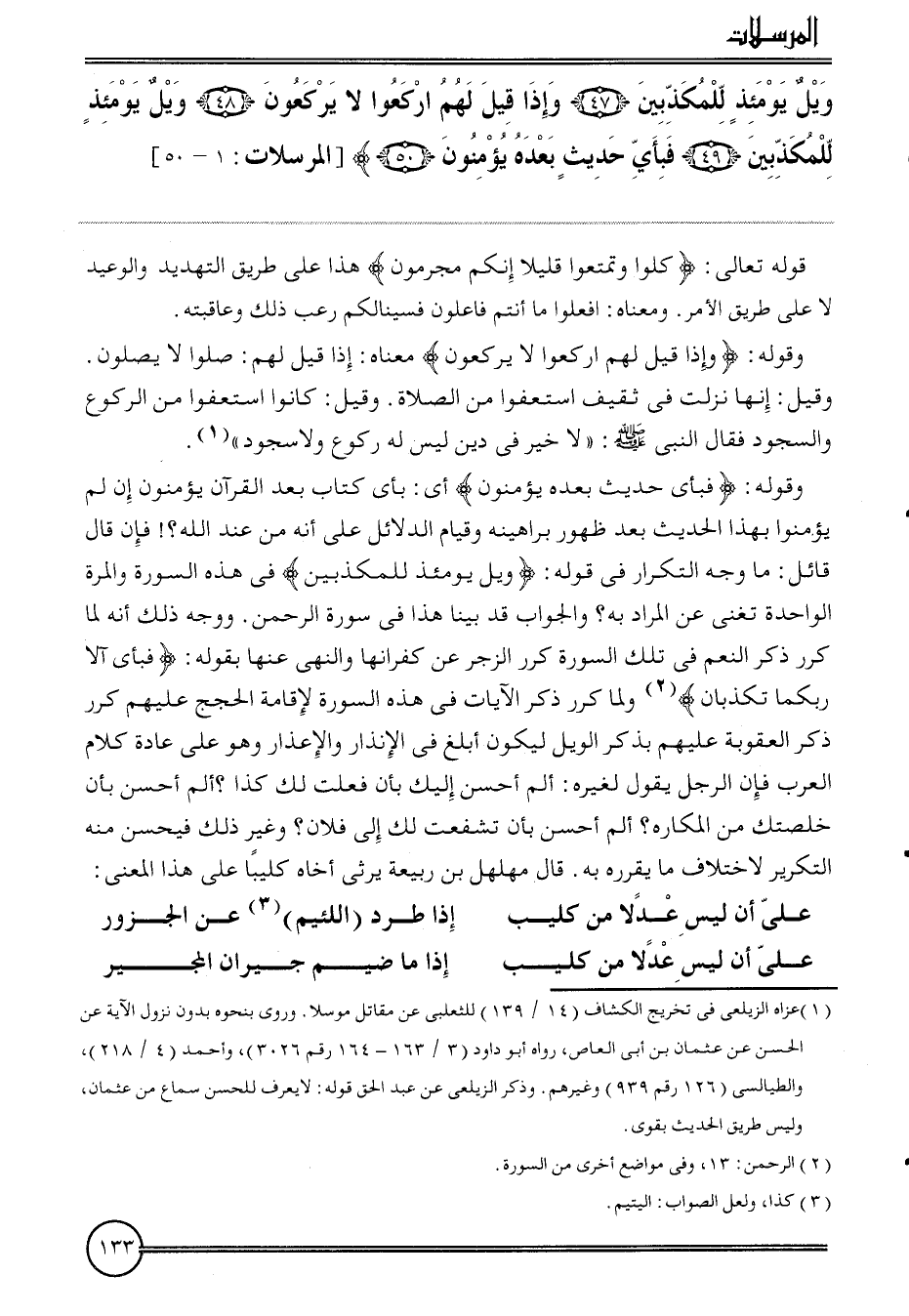 وَقَوله: {فَبِأَي حَدِيث بعده يُؤمنُونَ} أَي: بِأَيّ كتاب بعد الْقُرْآن يُؤمنُونَ إِن لم يُؤمنُوا بِهَذَا الحَدِيث بعد ظُهُور براهينه وَقيام الدَّلَائِل على أَنه من عِنْد الله؟ ! فَإِن قَالَ قَائِل: مَا وَجه التّكْرَار فِي قَوْله: {ويل يَوْمئِذٍ للمكذبين} فِي هَذِه السُّورَة والمرة الْوَاحِدَة تغني عَن المُرَاد بِهِ؟ وَالْجَوَاب قد بَينا هَذَا فِي سُورَة الرَّحْمَن.