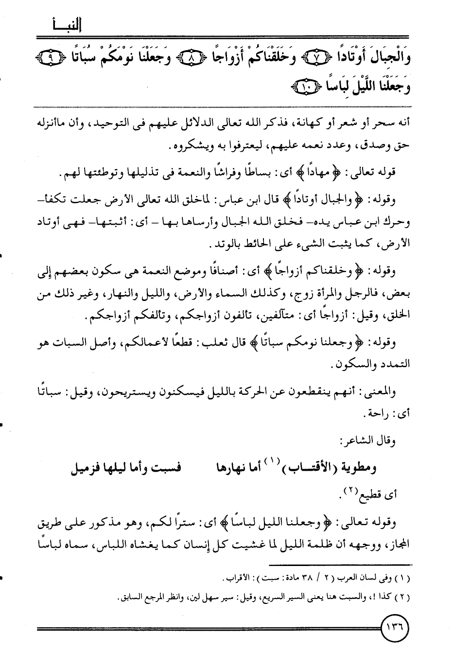 {وَالْجِبَال أوتادا (7) وخلقناكم أَزْوَاجًا (8) وَجَعَلنَا نومكم سباتا (9) وَجَعَلنَا اللَّيْل لباسا (10) } . أَنه سحر أَو شعر أَو كهَانَة، فَذكر الله تَعَالَى الدَّلَائِل عَلَيْهِم فِي التَّوْحِيد، وَأَن مَا أنزلهُ حق وَصدق، وَعدد نعمه عَلَيْهِم، ليعترفوا بِهِ ويشكروه.