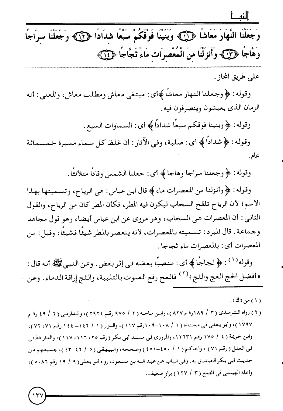 {وَجَعَلنَا النَّهَار معاشا (11) وبنينا فَوْقكُم سبعا شدادا (12) وَجَعَلنَا سِرَاجًا وهاجا (13) وأنزلنا من المعصرات مَاء ثجاجا (14) على طَرِيق الْمجَاز.