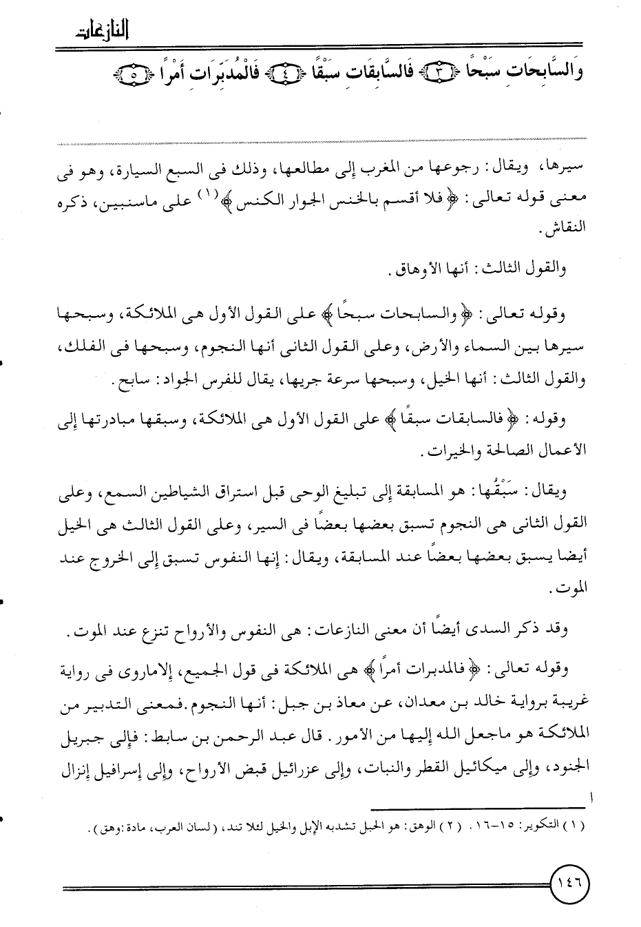 {والسابحات سبحا (3) فالسابقات سبقا (4) فالمدبرات أمرا (5) } . سَيرهَا، وَيُقَال: رُجُوعهَا من الْمغرب إِلَى مطالعها، وَذَلِكَ فِي السَّبع السيارة، وَهُوَ فِي معنى قَوْله تَعَالَى: {فَلَا أقسم بالخنس الْجوَار الكنس} على مَا سنبين، ذكره النقاش.