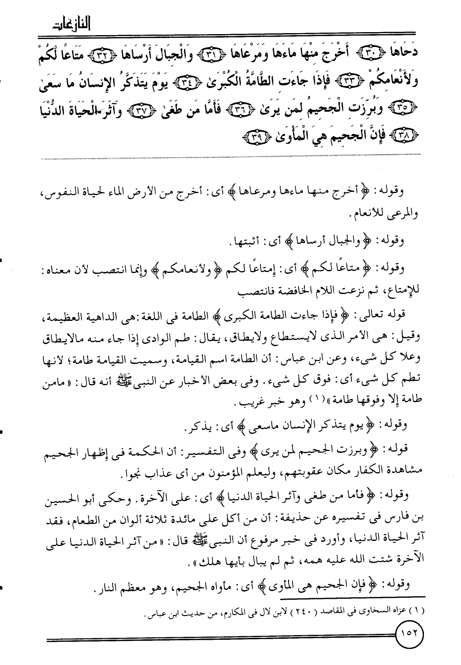 {دحاها (30) أخرج مِنْهَا ماءها ومرعاها (31) وَالْجِبَال أرساها (32) مَتَاعا لكم ولأنعامكم (33) فَإِذا جَاءَت الطامة الْكُبْرَى (34) يَوْم يتَذَكَّر الْإِنْسَان مَا سعى (35) وبرزت الْجَحِيم لمن يرى (36) فَأَما من طَغى (37) وآثر الْحَيَاة الدُّنْيَا (38) فَإِن الْجَحِيم هِيَ المأوى (39) } .