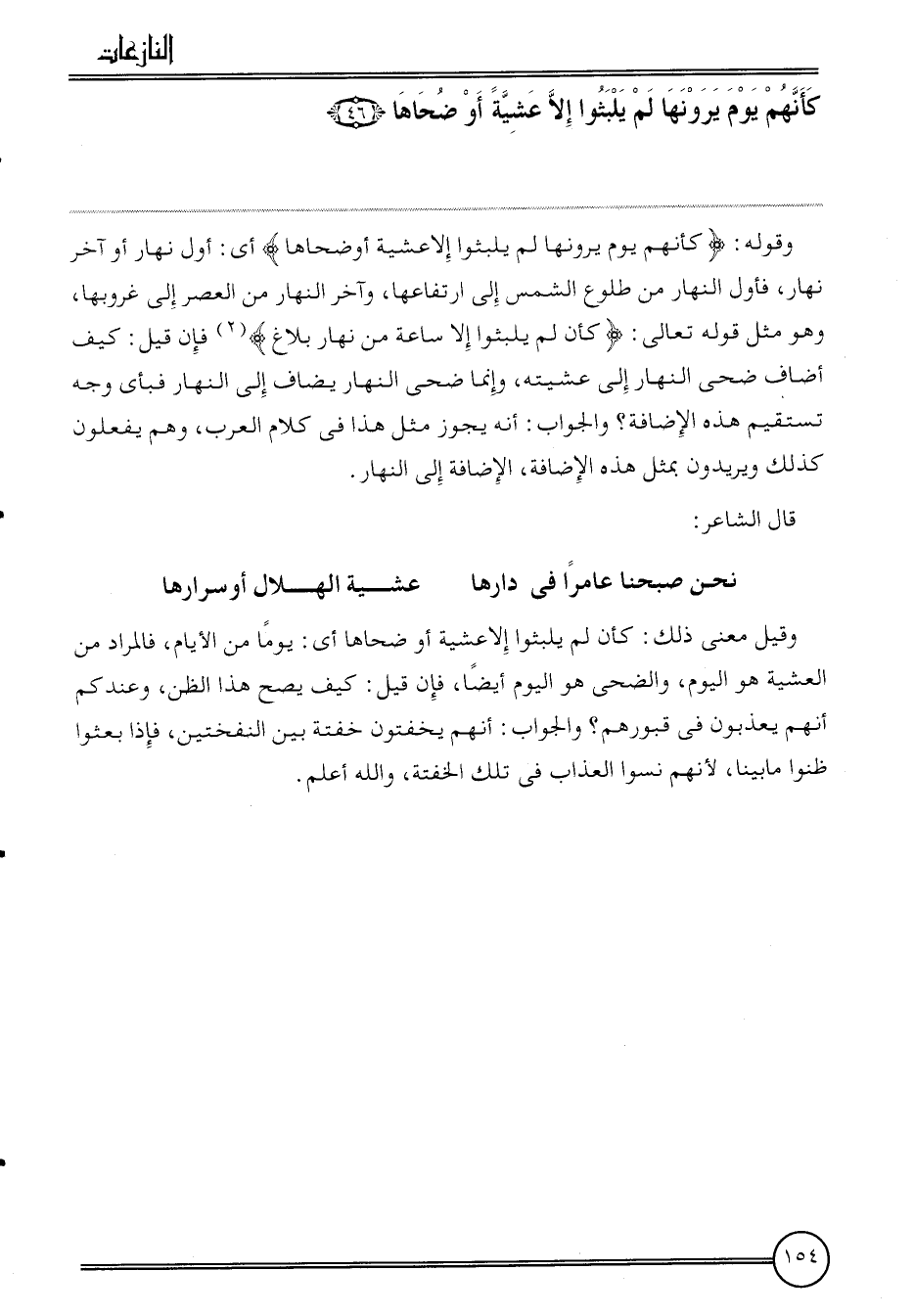 وَقَوله: {كَأَنَّهُمْ يَوْم يرونها لم يَلْبَثُوا إِلَّا عَشِيَّة أَو ضحاها} أَي: أول نَهَار أَو آخر نَهَار، فَأول النَّهَار من طُلُوع الشَّمْس إِلَى ارتفاعها، وَآخر النَّهَار من الْعَصْر إِلَى غُرُوبهَا، وَهُوَ مثل قَوْله تَعَالَى: {كَأَن لم يَلْبَثُوا إِلَّا سَاعَة من نَهَار بَلَاغ} فَإِن قيل: كَيفَ أضَاف ضحى النَّهَار إِلَى عشيته، وَإِنَّمَا ضحى النَّهَار يُضَاف إِلَى النَّهَار فَبِأَي وَجه تستقيم هَذِه الْإِضَافَة؟ وَالْجَوَاب: أَنه يجوز مثل هَذَا فِي كَلَام الْعَرَب، وهم يَفْعَلُونَ كَذَلِك ويريدون بِمثل هَذِه الْإِضَافَة، الْإِضَافَة إِلَى النَّهَار.