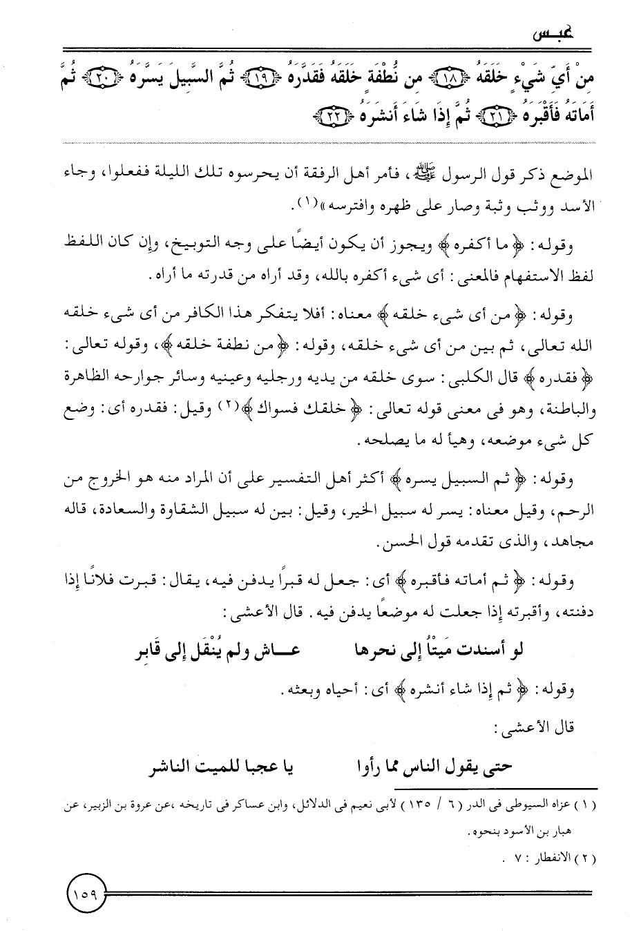 {من أَي شَيْء خلقه (18) من نُطْفَة خلقه فقدره (19) ثمَّ السَّبِيل يسره (20) ثمَّ أَمَاتَهُ فأقبره (21) ثمَّ إِذا شَاءَ أنشره (22) } . الْموضع ذكر قَول الرَّسُول، فَأمر أهل الرّفْقَة أَن يحرسوه تِلْكَ اللَّيْلَة فَفَعَلُوا، وَجَاء الْأسد وثب وثبة وَصَارَ على ظَهره وافترسه ".