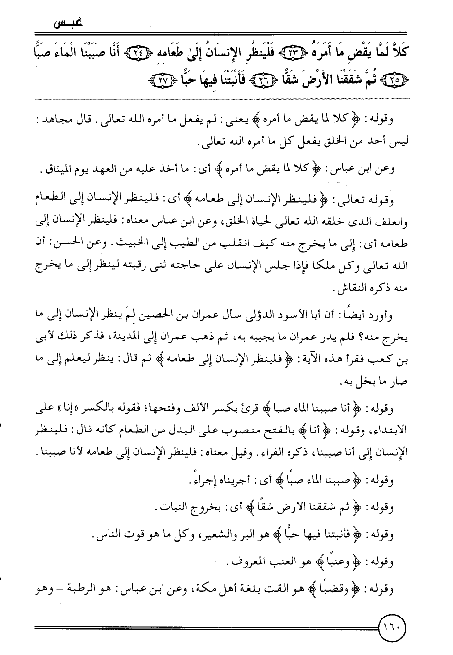 {كلا لما يقْض مَا أمره (23) فَلْينْظر الْإِنْسَان إِلَى طَعَامه (24) أَنا صببنا المَاء صبا (25) ثمَّ شققنا الأَرْض شقا (26) فَأَنْبَتْنَا فِيهَا حبا (27) } .