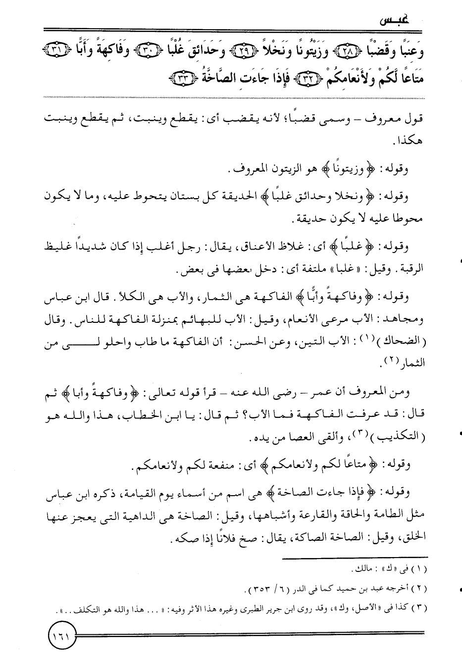 وَمن الْمَعْرُوف أَن عمر - رَضِي الله عَنهُ - قَرَأَ قَوْله تَعَالَى: {وَفَاكِهَة وَأَبا} ثمَّ قَالَ: قد عرفت الْفَاكِهَة فَمَا الْأَب؟ ثمَّ قَالَ: يَا ابْن الْخطاب، هَذَا وَالله هُوَ (التَّكْذِيب) ، وَألقى الْعَصَا من يَده.