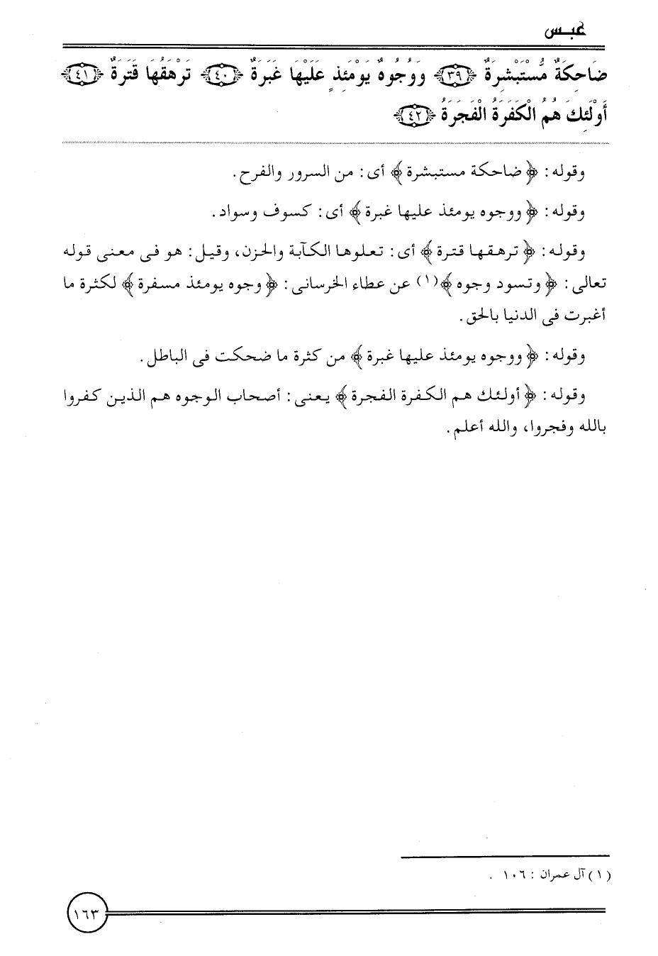 {ضاحكة مستبشرة (39) ووجوه يَوْمئِذٍ عَلَيْهَا غبرة (40) ترهقها قترة (41) أُولَئِكَ هم الْكَفَرَة الفجرة (42) } .