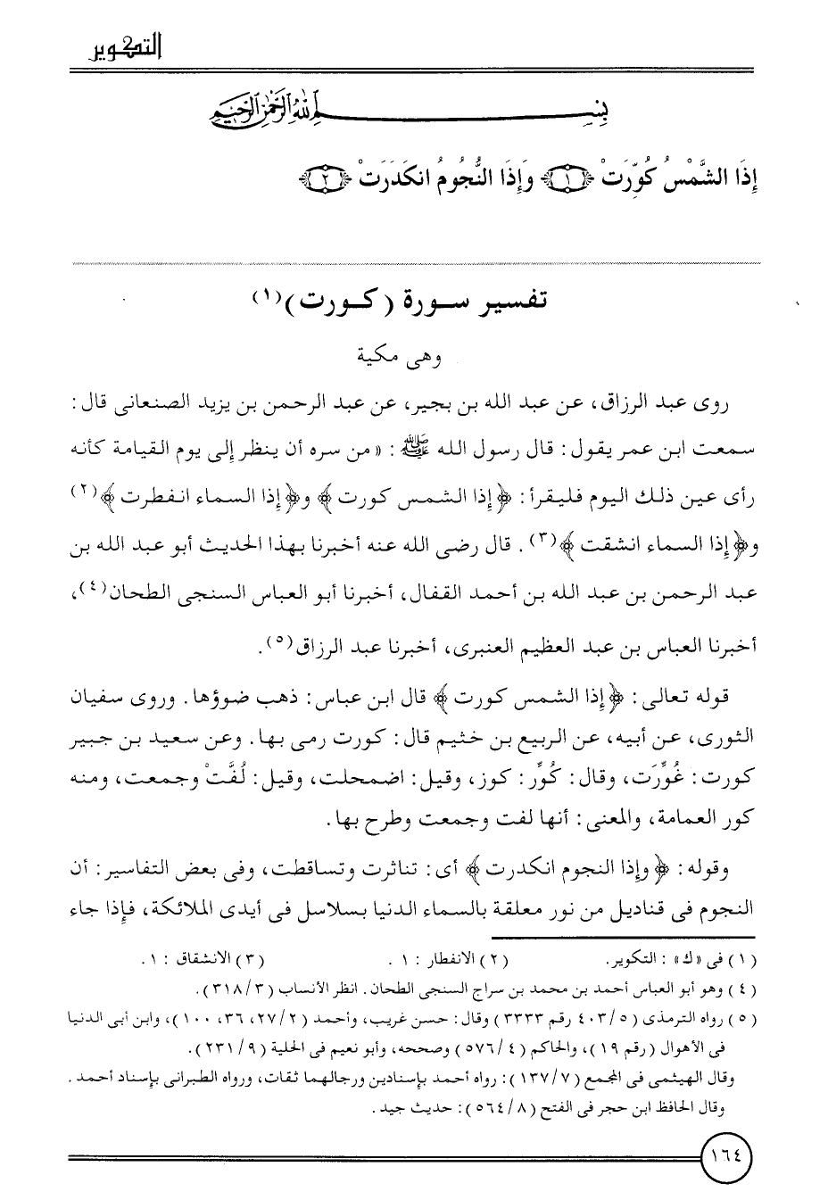 روى عبد الرَّزَّاق، عَن عبد الله بن بجير، عَن عبد الرَّحْمَن بن يزِيد الصَّنْعَانِيّ قَالَ: سَمِعت ابْن عمر يَقُول: قَالَ رَسُول الله: " من سره أَن ينظر إِلَى يَوْم الْقِيَامَة كَأَنَّهُ رأى عين ذَلِك الْيَوْم فليقرأ: {إِذا الشَّمْس كورت} و {إِذا السَّمَاء انفطرت} و (إِذا السَّمَاء انشقت) .