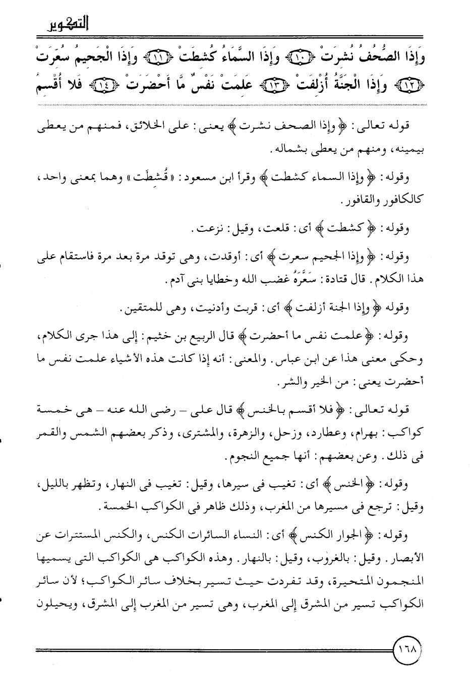 {وَإِذا الصُّحُف نشرت (10) وَإِذا السَّمَاء كشطت (11) وَإِذا الْجَحِيم سعرت (12) وَإِذا الْجنَّة أزلفت (13) علمت نفس مَا أحضرت (14) فَلَا أقسم} .
