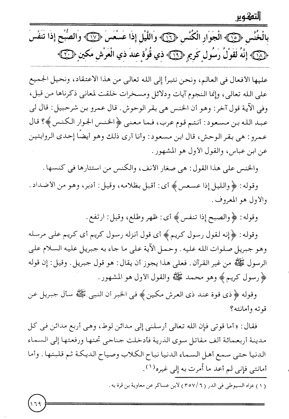 {بالخنس (15) الْجوَار الكنس (16) وَاللَّيْل إِذا عسعس (17) وَالصُّبْح إِذا تنفس (18) إِنَّه لقَوْل رَسُول كريم (19) ذِي قُوَّة عِنْد ذِي الْعَرْش مكين (20) } . عَلَيْهَا الْأَفْعَال فِي الْعَالم، وَنحن نتبرأ إِلَى الله تَعَالَى من هَذَا الِاعْتِقَاد، ونحيل الْجَمِيع على الله تَعَالَى، وَإِنَّمَا النُّجُوم آيَات وَدَلَائِل ومسخرات خلقت لمعاني ذَكرنَاهَا من قبل، وَفِي الْآيَة قَول آخر: وَهُوَ أَن الخنس هِيَ بقر الوحوش.