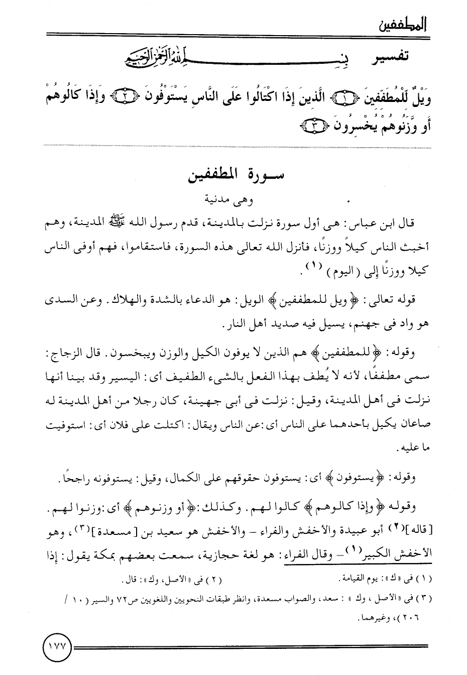 {ويل لِلْمُطَفِّفِينَ (1) الَّذين إِذا اكتالوا على النَّاس يستوفون (2) وَإِذا كالوهم أَو وزنوهم يخسرون (3) } .