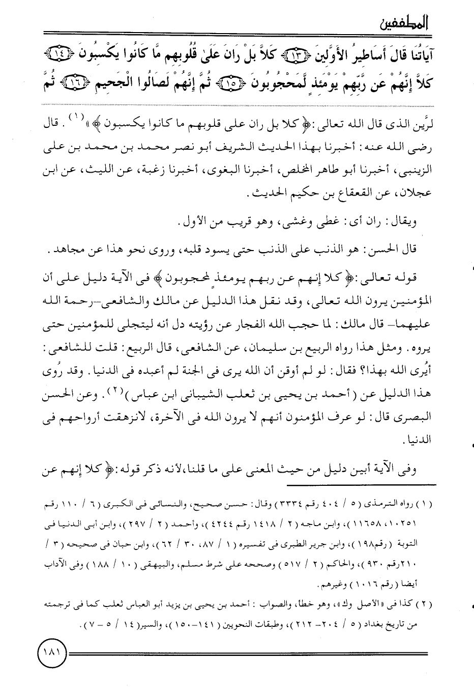 قَوْله تَعَالَى: {كلا إِنَّهُم عَن رَبهم يؤمئذ لمحجوبون} فِي الْآيَة دَلِيل على أَن الْمُؤمنِينَ يرَوْنَ الله تَعَالَى، وَقد نقل هَذَا الدَّلِيل عَن مَالك وَالشَّافِعِيّ - رَحْمَة الله عَلَيْهِمَا - قَالَ مَالك: لما حجب الله الْفجار عَن رُؤْيَته دلّ أَنه ليتجلى للْمُؤْمِنين حَتَّى يروه.