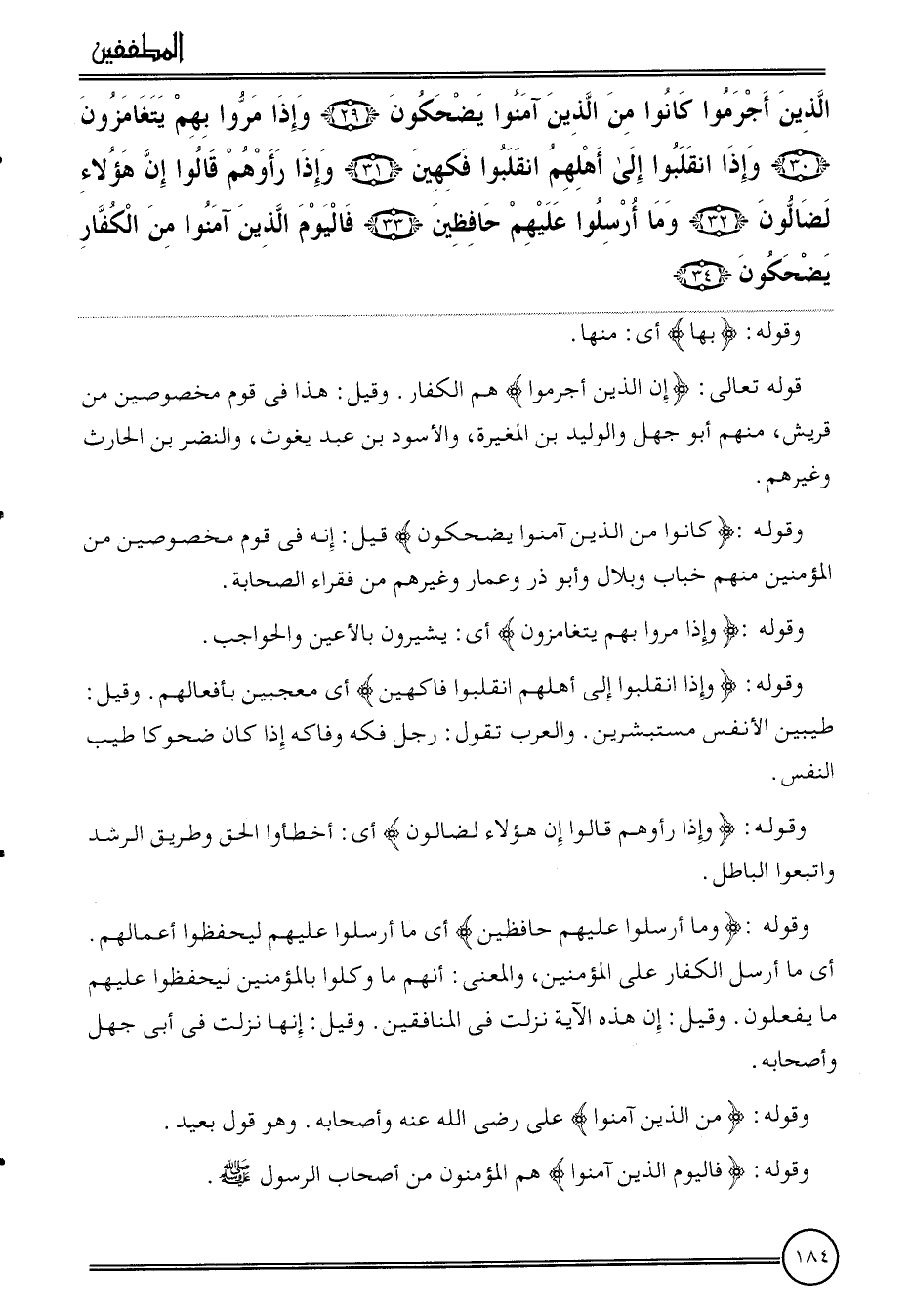 {الَّذين أجرموا كَانُوا من الَّذين آمنُوا يَضْحَكُونَ (29) وَإِذا مروا بهم يتغامزون (30) وَإِذا انقلبوا إِلَى أهلهم انقلبوا فكهين (31) وَإِذا رَأَوْهُمْ قَالُوا إِن هَؤُلَاءِ لضالون (32) وَمَا أرْسلُوا عَلَيْهِم حافظين (33) فاليوم الَّذين آمنُوا من الْكفَّار يَضْحَكُونَ (34) } .