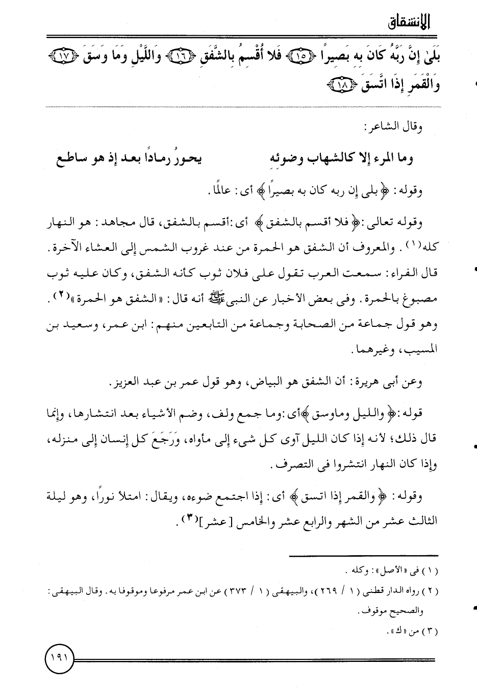 {بلَى إِن ربه كَانَ بِهِ بَصيرًا (15) فَلَا أقسم بالشفق (16) وَاللَّيْل وَمَا وسق (17) وَالْقَمَر إِذا اتسق (18) } .