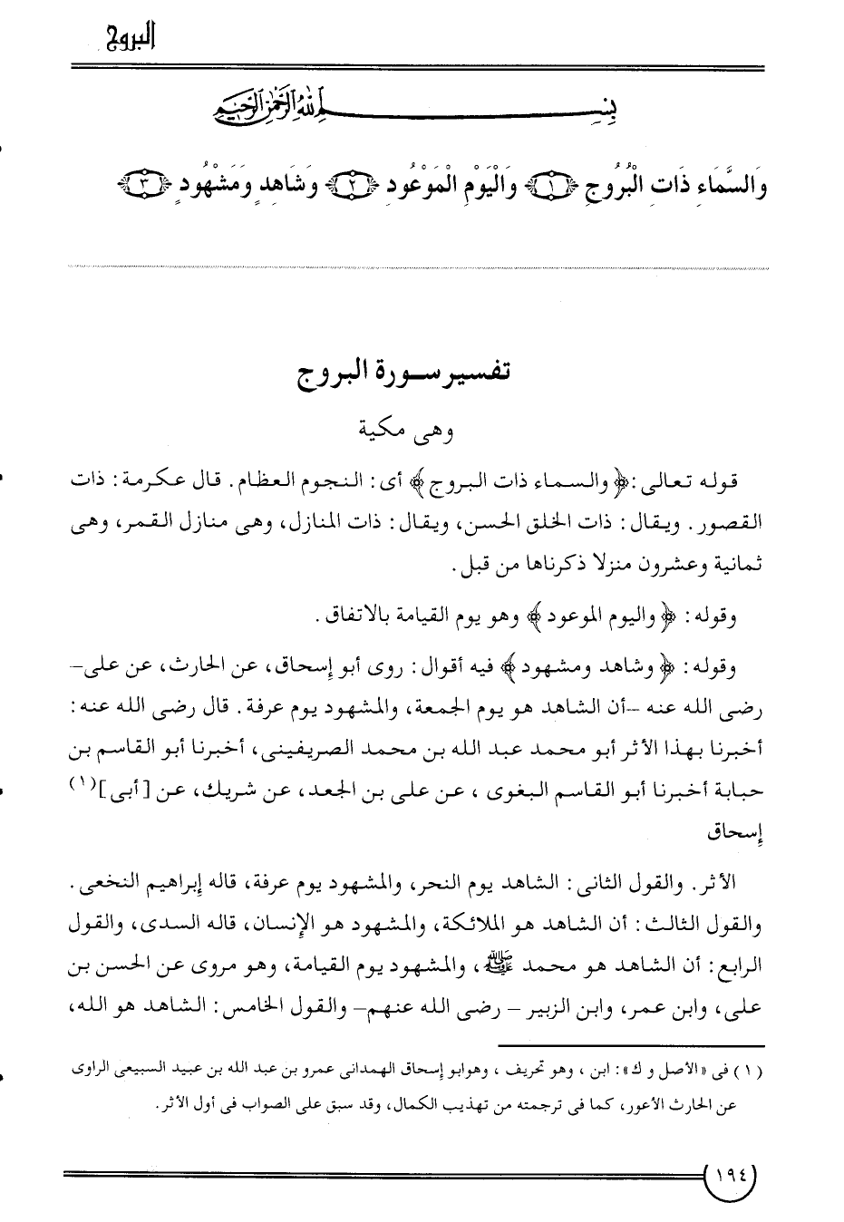 {وَالسَّمَاء ذَات البروج (1) وَالْيَوْم الْمَوْعُود (2) وَشَاهد ومشهود (3) } .